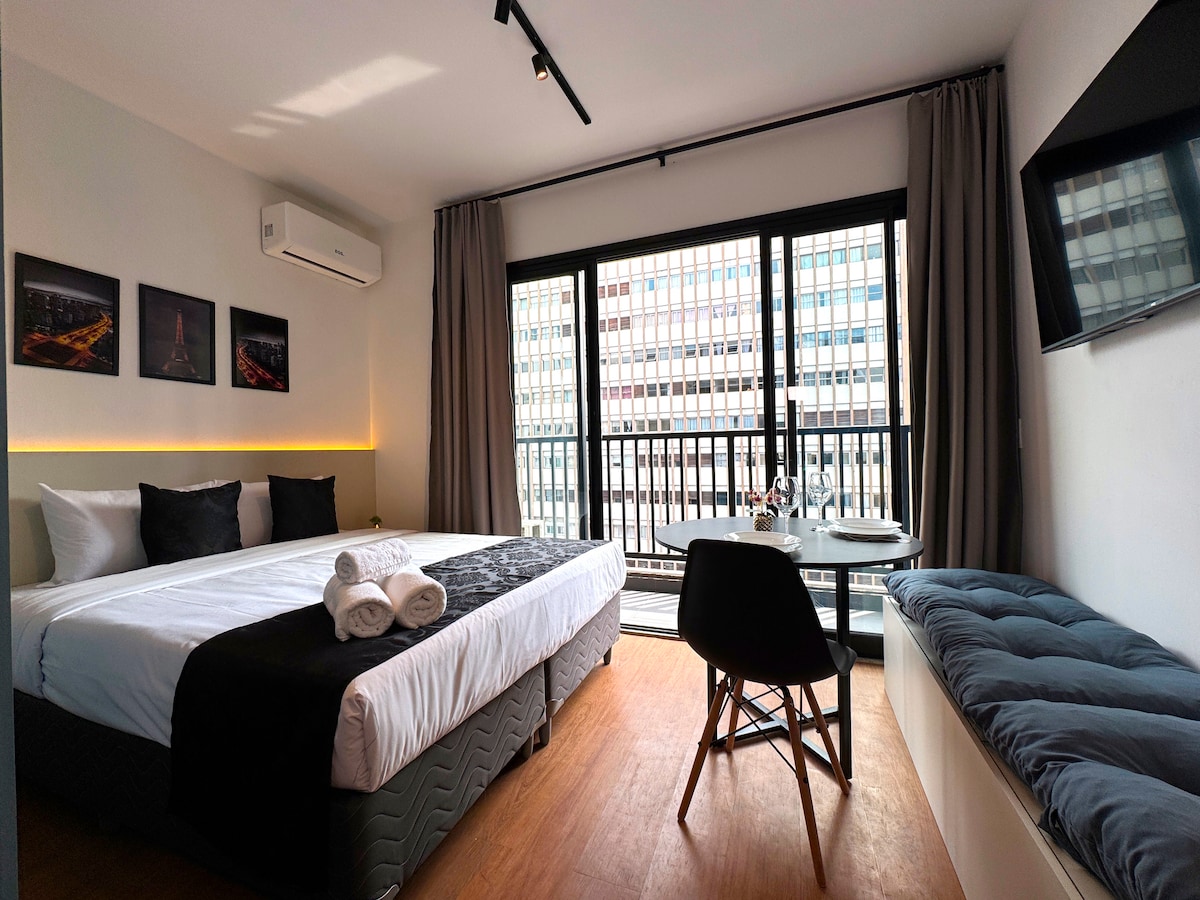 O studio fica no 31º andar do edifício mais alto do centro, com um design moderno e acolhedor, além de uma vista impressionante da cidade. Da janela, é possível admirar o Vale do Anhangabaú, Centro Histórico, as antenas da Av. Paulista: uma das paisagens mais belas de SP. É o prédio onde fica o SampaSky e é possível caminhar para as principais atrações do centro. Conta com ar condicionado, TV de 55'' com apps, cozinha equipada com utensílios básicos, cooktop (1 boca), microondas e frigobar.
