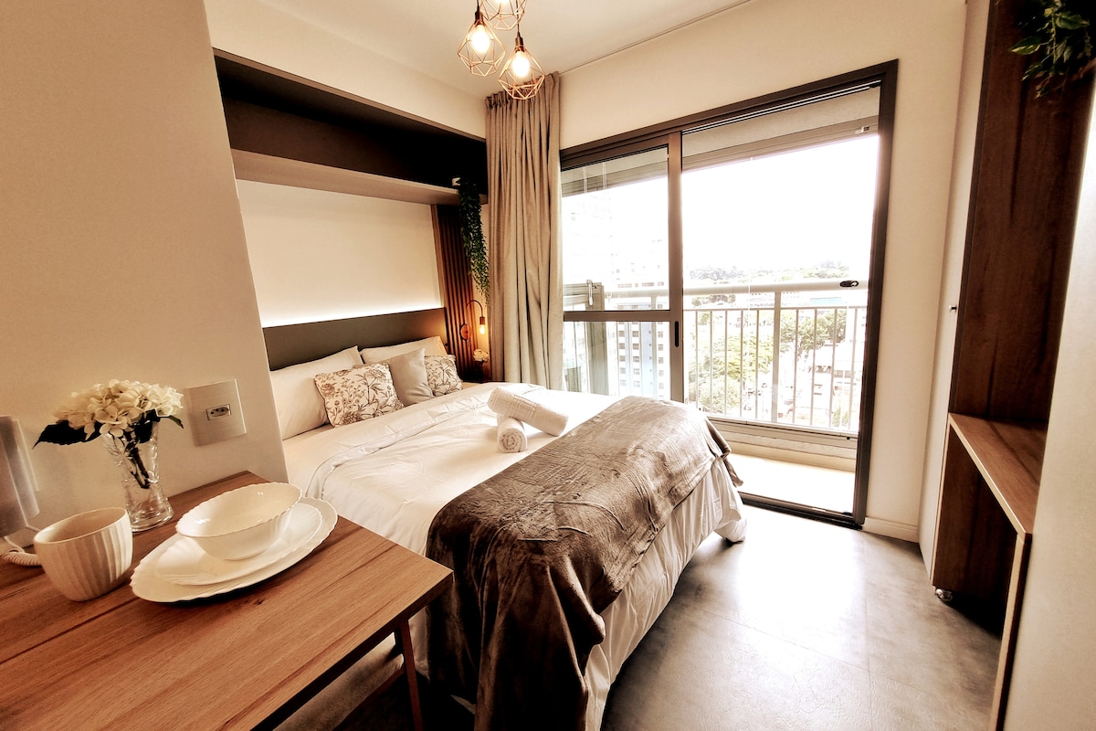 Enjoy practicality and warmth in this peaceful and well-located place in Moema, a prime area of São Paulo. Close to Ibirapuera Park and the Moema subway station, it is the ideal place for gastronomic, cultural, leisure and business tourism. Decorated studio with equipped kitchen, bed and bath linen, air conditioning and Wi-Fi. New building overlooking the park, offering a pool, gym, co-working, laundry and 24-hour concierge.