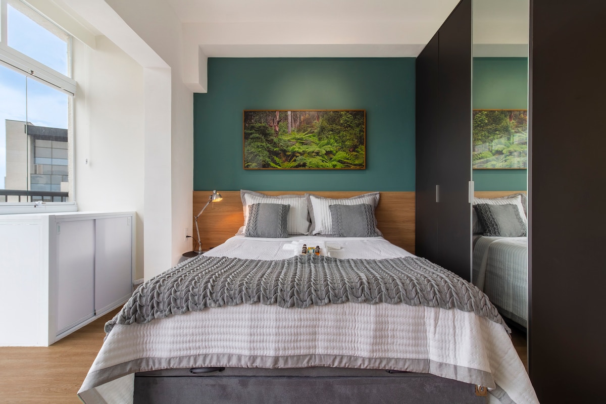 The Gray Box Downtown is a Studio located on Rua da Consolacao. Super central and next to the Metro (500m). São Paulo Downtown full of historic buildings and abundant gastronomic offer. Come and experience the center of São Paulo in our super studio set up in a building full of living areas. And we even have a washing machine inside the Studio for your convenience! We also have a cold water filter! All of our towels and bed linen are Buddemeyer and the sheets are 300 thread count. Queen Bed
