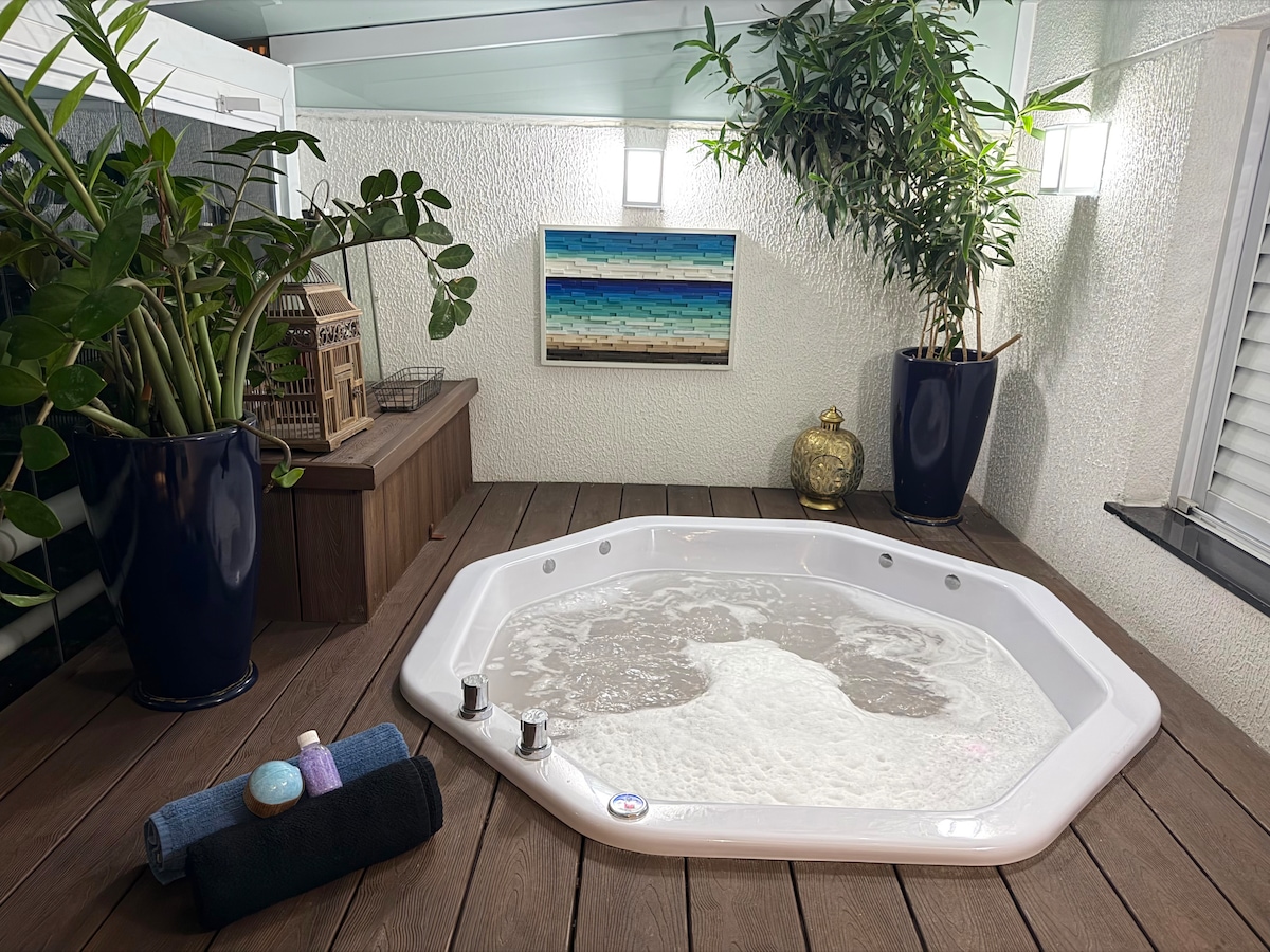 Apto Garden fechado c/ JACUZZI PRIVATIVA. NÃO É PERMITIDO FUMAR ou RECEBER VISITANTES. Não abrimos exceção. Possui 1 quarto com cama queen e 1 sofá cama queen para ser usado por mais 2 hóspedes pagantes na reserva. AS ALMOFADAS E SUPORTES METÁLICOS DA BANHEIRA SÃO MERAMENTE ILUSTRATIVAS. Solicitamos FOTO DO DOCUMENTO DE IDENTIDADE de cada hóspede, enviadas no chat do Airbnb assim que a reserva confirmada, para o processo do Checkin. Favor checar as regras da casa para detalhes.