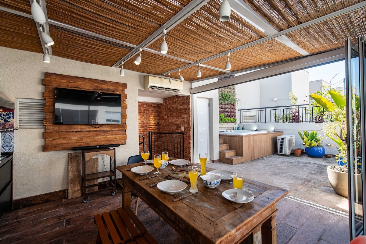 Desfrute da melhor localização da Vila Madalena em uma cobertura duplex estilo loft (110 m²), com uma vista incrível de São Paulo. Ideal para estadias temporárias residenciais, perfeita para pessoas que buscam conforto, privacidade e tranquilidade. 1º andar: sala, home office, cozinha e lavabo. 2º andar: suíte com acesso à área privativa coberta em vidro, com churrasqueira e jacuzzi. 2 vagas de garagem. Uso exclusivamente residencial. Não são permitidos eventos ou festas.