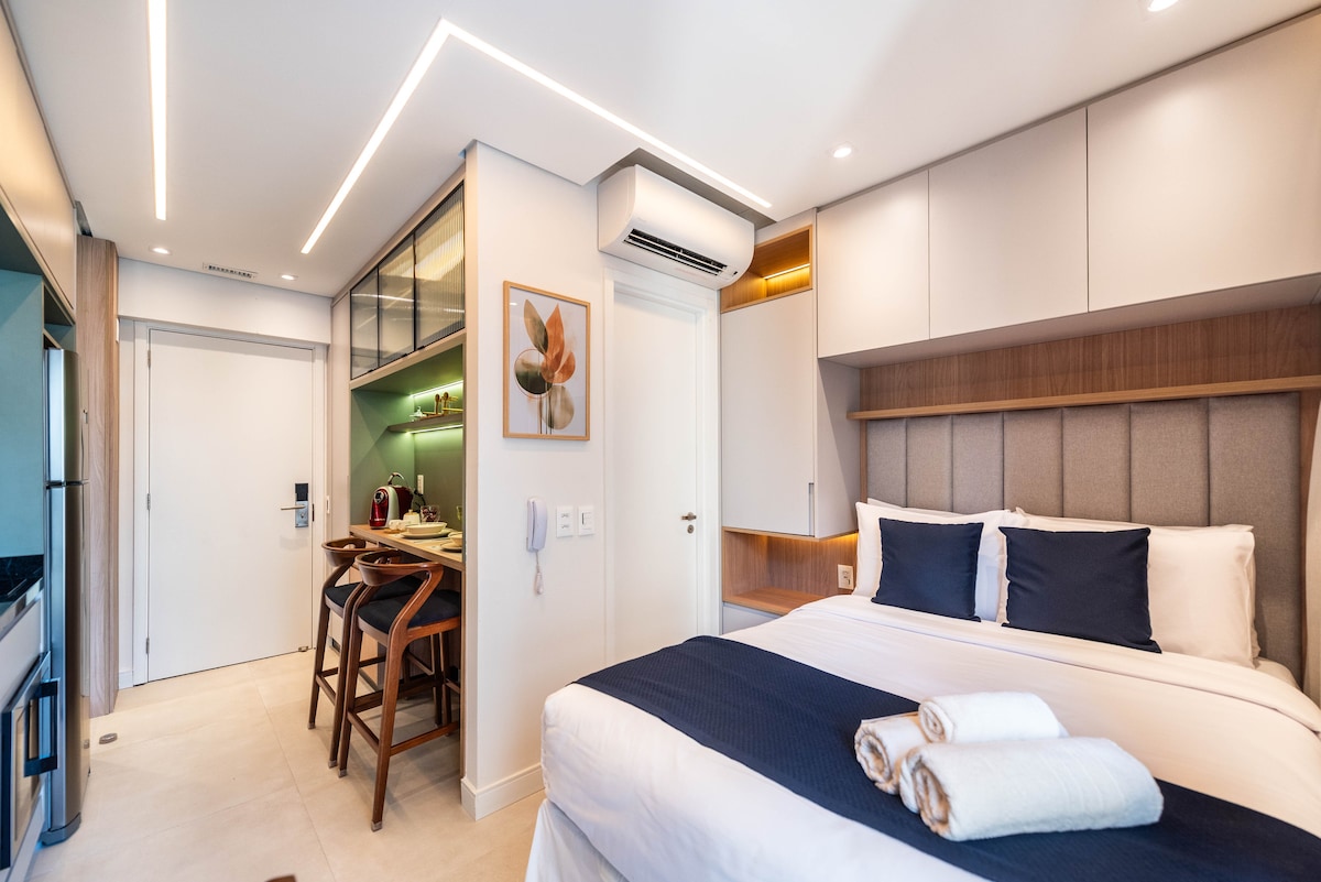 Welcome and make yourselves at home. The apartment is brand new, designed especially for you and has impeccable decor, very practical for everyday life. The view is spectacular! The apartment is on the 28th floor. We are in an excellent location in São Paulo, in the Pinheiros neighborhood, with restaurants, supermarkets and bakeries very close by. It's 40m2 (430 sqft) with 1 bedroom and 1 bathroom. Walking distance from Fradique Coutinho subway station (just 2 blocks).