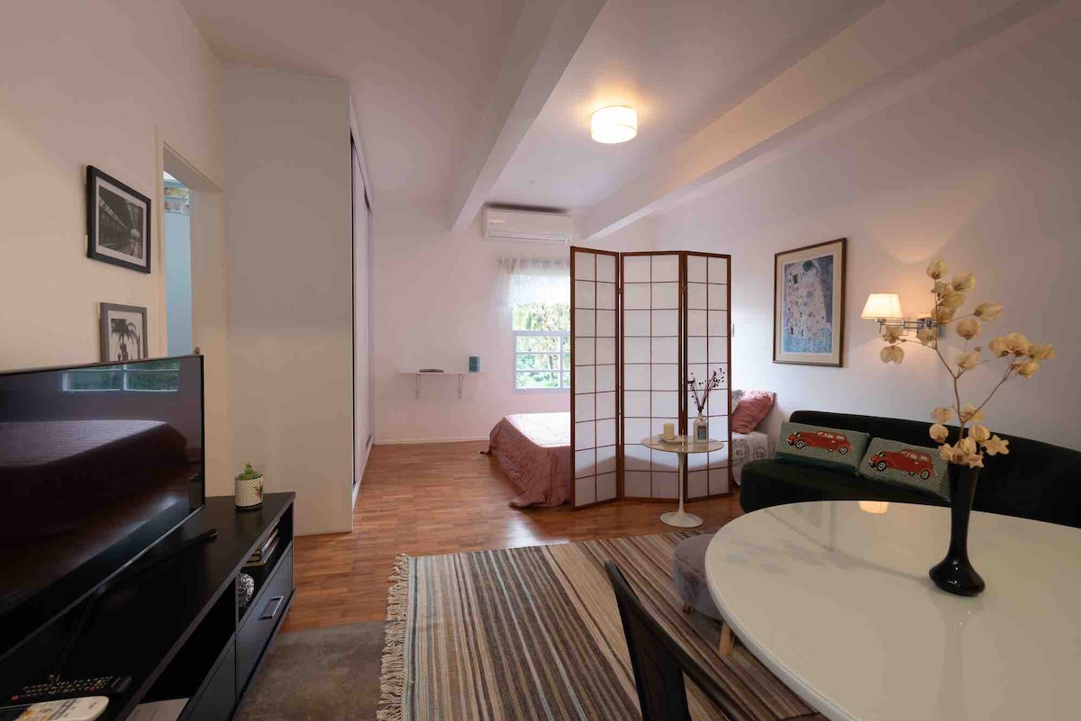 Opening the doors of our home to share this special place with you. Separate from the main house and with a private entrance, you have total privacy. Our backyard is full of trees and full of birds. Enjoy the silence and tranquility as if you were in a country house. Spacious bedroom integrated with the living room, and well-equipped kitchen with Breakfast bar. Private bathroom and shower with solar heating. Work desk with 300Mb Wi-Fi for home office and Smart TV with Netflix.