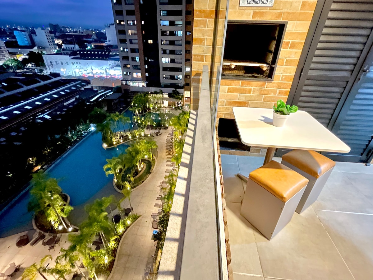 Um apartamento compacto de 20m² ideal para estadias práticas e confortáveis. Ele conta com uma cama de casal aconchegante, perfeita para uma boa noite de descanso, e um ar-condicionado que garante conforto térmico. A cozinha compacta é funcional e equipada com um micro-ondas, uma pia e utensílios básicos, proporcionando praticidade para preparar refeições rápidas. O banheiro é privativo, com chuveiro e espaço suficiente para atender às necessidades diárias com conforto.