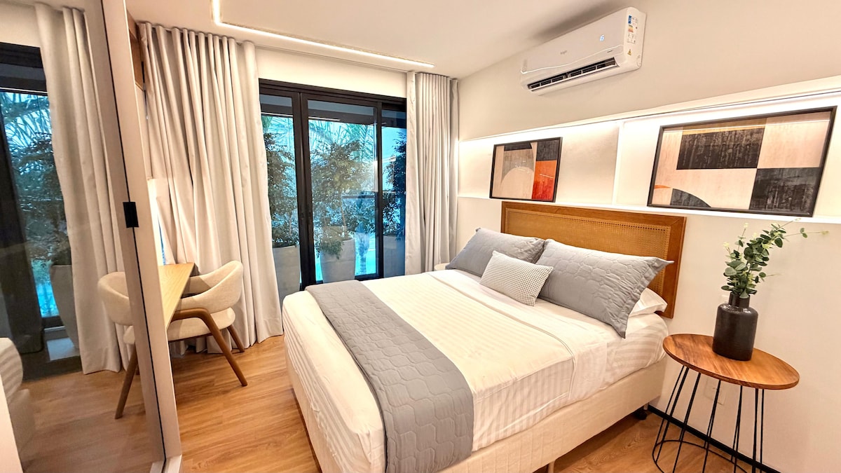 Newly renovated and fully furnished luxury apartment. Very close Eucaliptos metro! Features include deluxe bedding, 50" and 32" TVs, 500MB WiFi, complete kitchen with cooktop, Air Frier, stone countertops, AC, mini fridge, microwave, and complimentary drinks at the BAR (wines at an additional cost). Located in the heart of Moema, just 50m from Shopping Ibirapuera. Close to top restaurants, shops, and attractions like Ibirapuera Park. Partial valet parking available. Inquire for details.