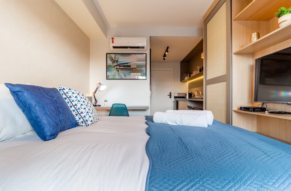 Seja a trabalho ou descanso, este stúdio moderno e acolhedor no Brooklin é o espaço ideal para sua estadia em São Paulo. Apenas 5 minutos a pé da estação Brooklin próximo ao Shopping Morumbi, o estúdio oferece tudo que você precisa para uma estadia tranquila e prática. 5 minutos do Consulado Americano Brooklin e Borba Gato a poucos passos Próximo a supermercados, padarias, farmácias e restaurantes 15 min do Vibra SP/ 15 min do Estádio do Morumbi A região é tranquila, segura e bem conectada.