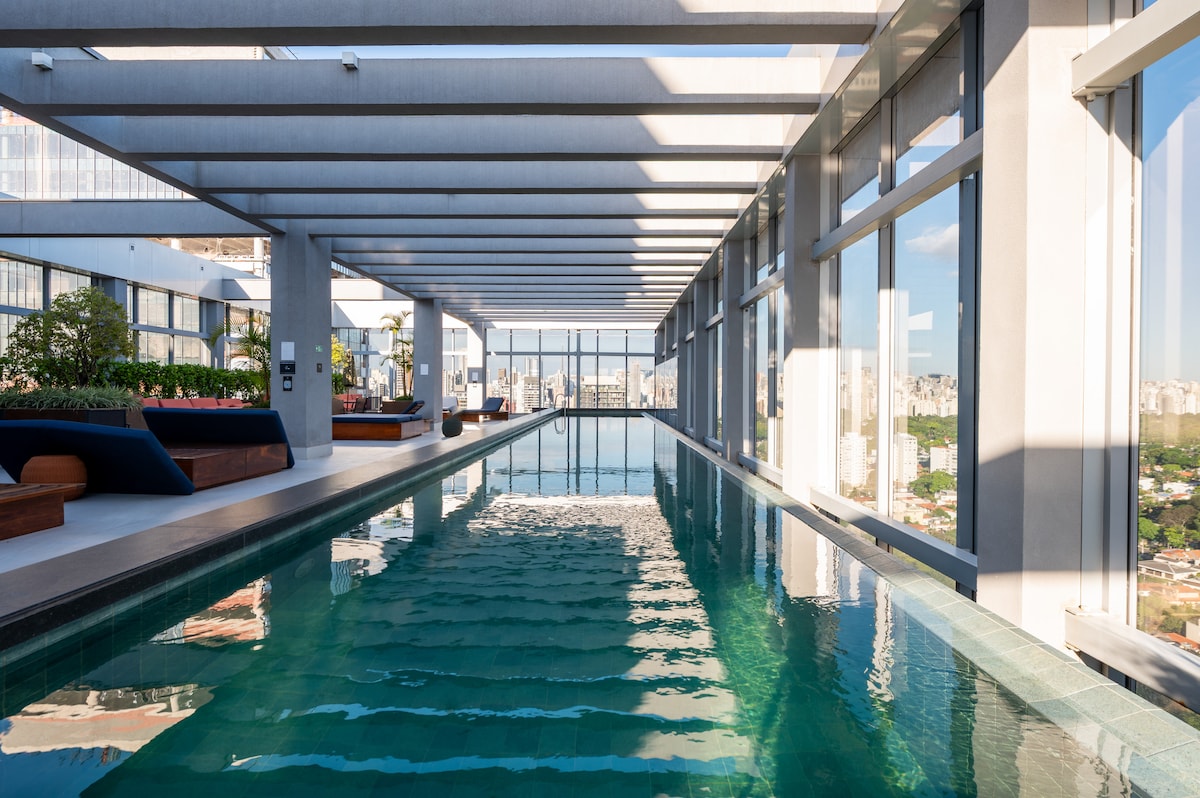Welcome and make yourselves at home. The apartment is brand new, designed especially for you and has impeccable decor, very practical for everyday life. The view is spectacular! The apartment is on the 28th floor. We are in an excellent location in São Paulo, in the Pinheiros neighborhood, with restaurants, supermarkets and bakeries very close by. It's 40m2 (430 sqft) with 1 bedroom and 1 bathroom. Walking distance from Fradique Coutinho subway station (just 2 blocks).
