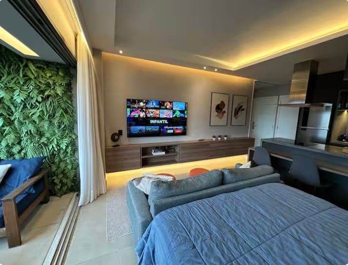 New studio, very well decorated and equipped, with all the necessary amenities for your stay. Fully automated, comfortable, cozy. The building is modern with an excellent leisure infrastructure: swimming pool, gym, ballroom with bar, coworking, laundry and bike rack. It has a green view of the square, the street is quiet and easily accessible. It is located between the neighborhoods of Moema, Brooklin and Vila Olimpia, 5 minutes from Shopping Ibirapuera and 15 from Congonhas Airport.