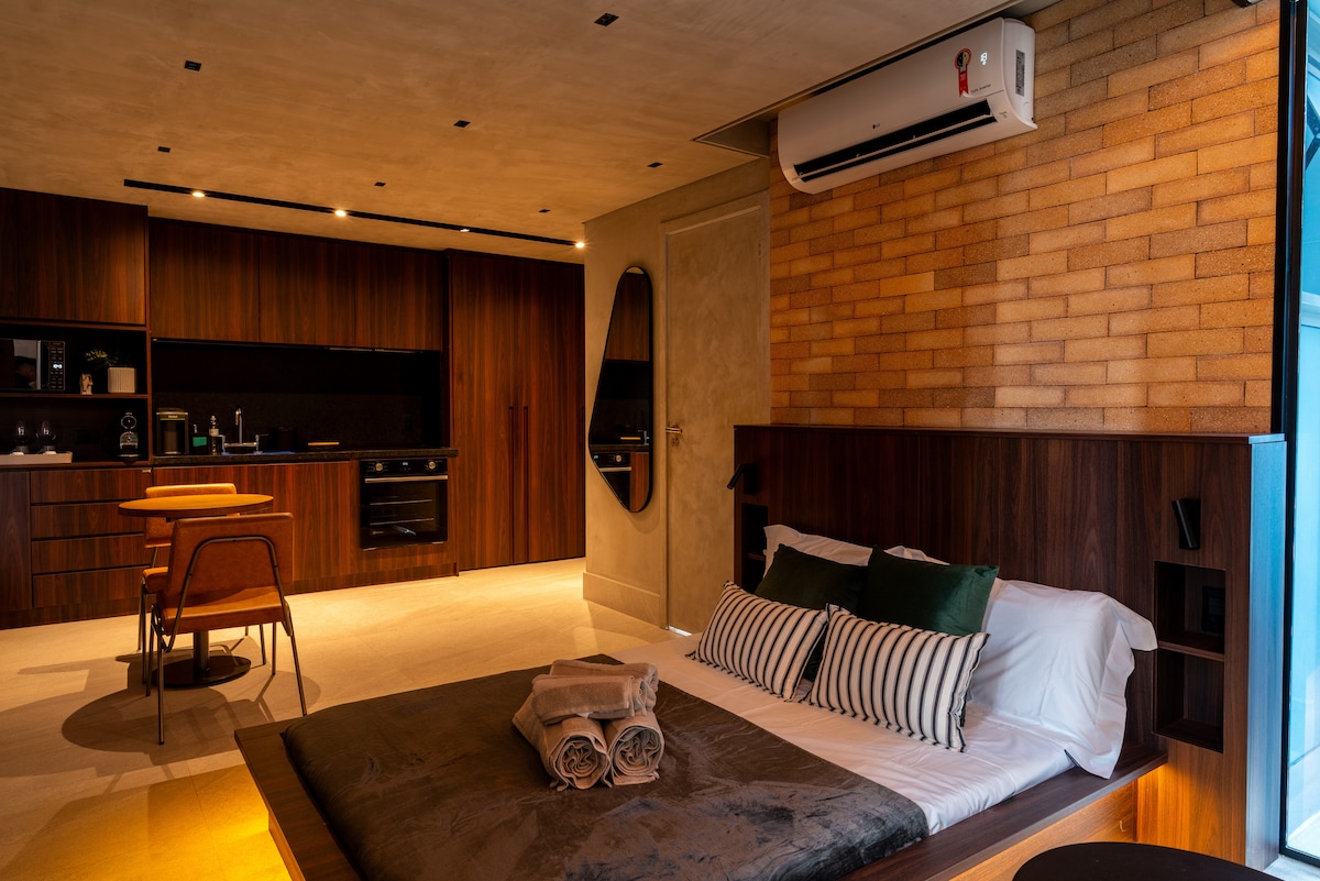 O studio fica no 31º andar do edifício mais alto do centro, com um design moderno e acolhedor, além de uma vista impressionante da cidade. Da janela, é possível admirar o Vale do Anhangabaú, Centro Histórico, as antenas da Av. Paulista: uma das paisagens mais belas de SP. É o prédio onde fica o SampaSky e é possível caminhar para as principais atrações do centro. Conta com ar condicionado, TV de 55'' com apps, cozinha equipada com utensílios básicos, cooktop (1 boca), microondas e frigobar.