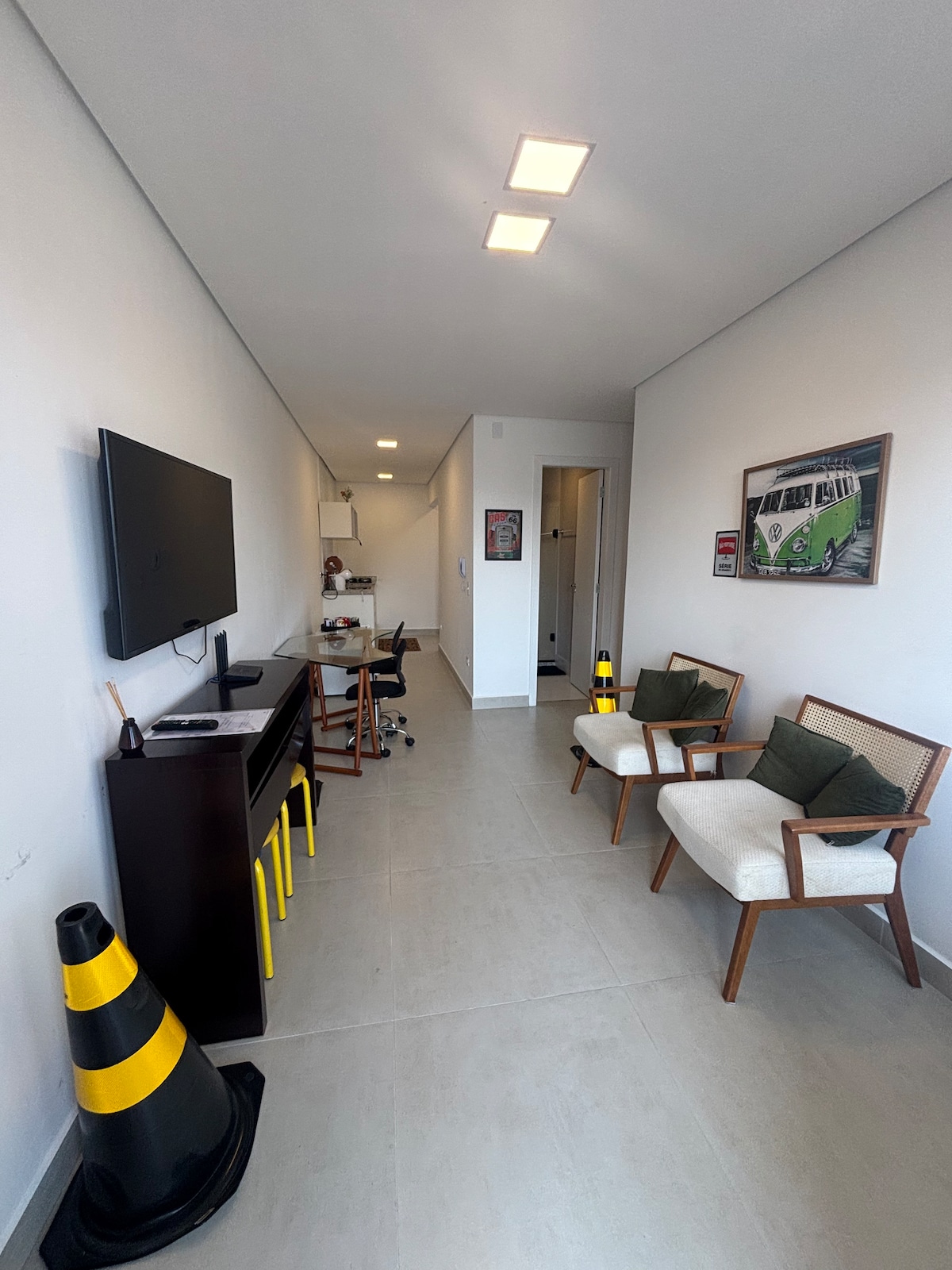 Apartamento com um quarto com cama queen, e sala com sofá cama para 1 adulto e uma criança, mesa e cadeira e TV Samsung 55", cozinha americana com frigobar, micro ondas, fogão, forno elétrico, cafeteira Keurig, panelas, formas metálicas e utensílios de cozinha. Para sua comodidade e conforto Lavadora e secadora de roupas LG. Secador de cabelo e prancha Revlon. Na cobertura piscina, sauna seca, ducha e lounge com mesa de bilhar. Estacionamento com manobrista. Serviço de Hotelaria diariamente.
