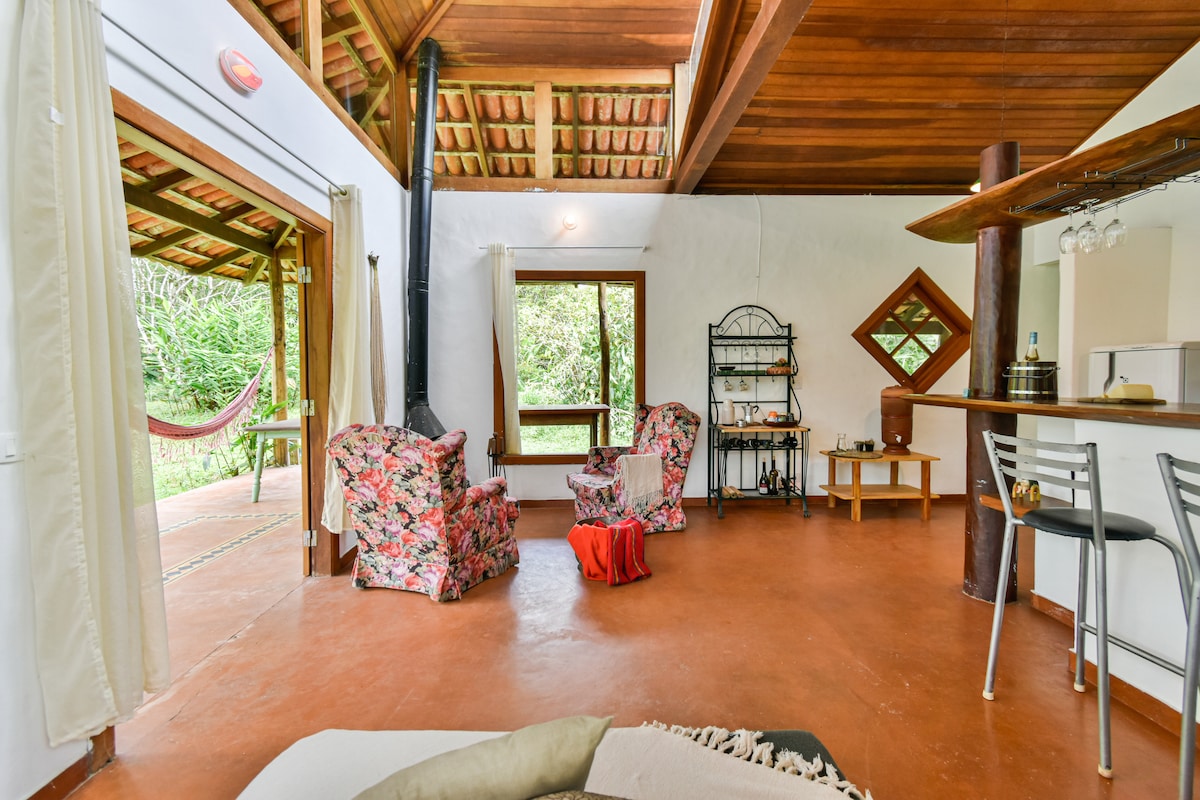 ALTO DAS TOCAS is a simple refuge in the exquisite Atlantic Forest, cozy and perfect for your stay. The perfect place to recharge, whether you're taking a hot shower overlooking the forest, reading in the garden or cooking on the outdoor patio. The house accommodates up to 4 people with great comfort and convenience. It has a bedroom suite, two beds (one super king and one pull-out bed), bathroom, full kitchen, bed and bath linen, parking and WI-FI.