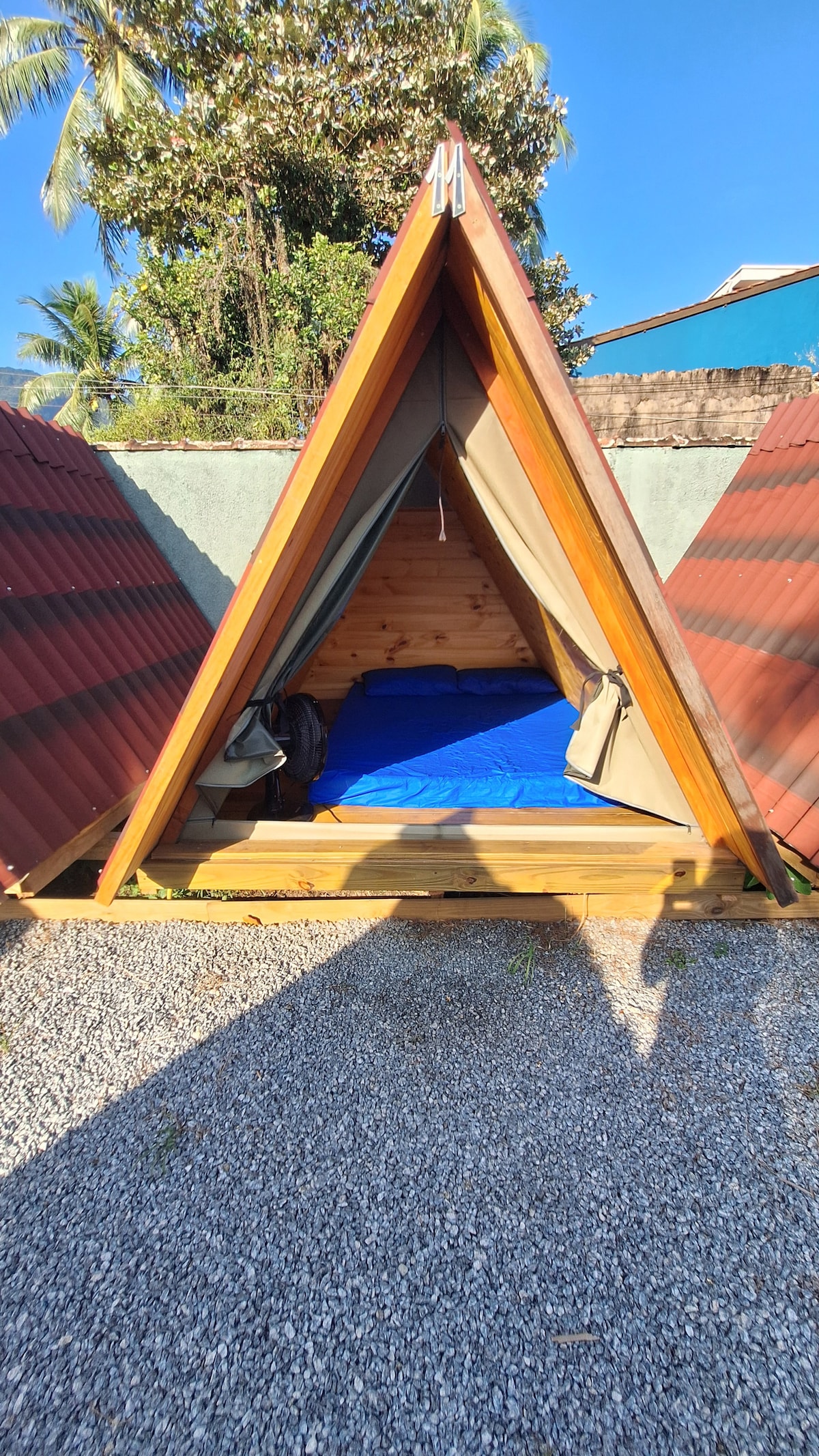 Este Chalé é maior (9m2), tem um otimo conforto termico, luz led, tomadas, ventilador, conta com um grande deck com bancos e mesas tem um confortavel colchão, lençol, travesseiros. os banheiro compartilhado, São 9 box (4 masculino e 4 Feminino e um banheiro unissex, área para convivência, churrasqueira e área para refeições ao ar livre.