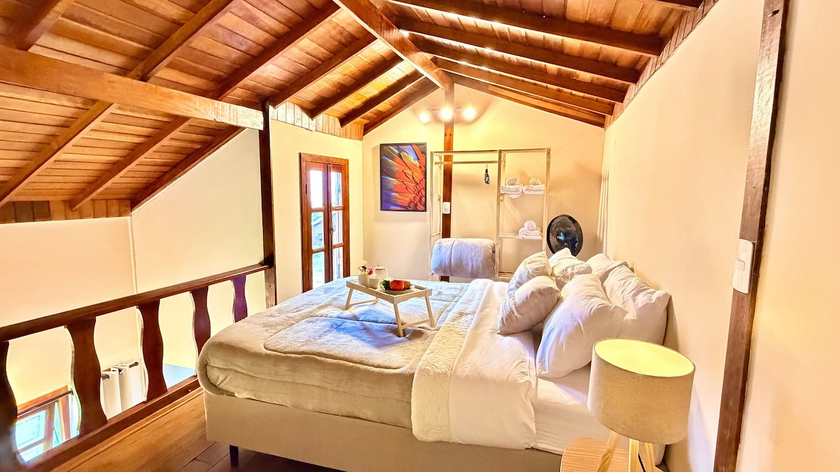 Se você busca uma conexão com a natureza sem abrir mão do aconchego, o Espaço Aves foi feito para você. Localizado dentro do Haras Nashville, este chalé oferece uma experiência sensorial única, onde as cores e a leveza das aves ditam o ritmo da sua estada. Com quadros vibrantes de araras, elementos em palha natural e muito verde, criamos um "ninho" de sofisticação e paz. Perfeito para quem busca um cenário alegre, iluminado e relaxante.