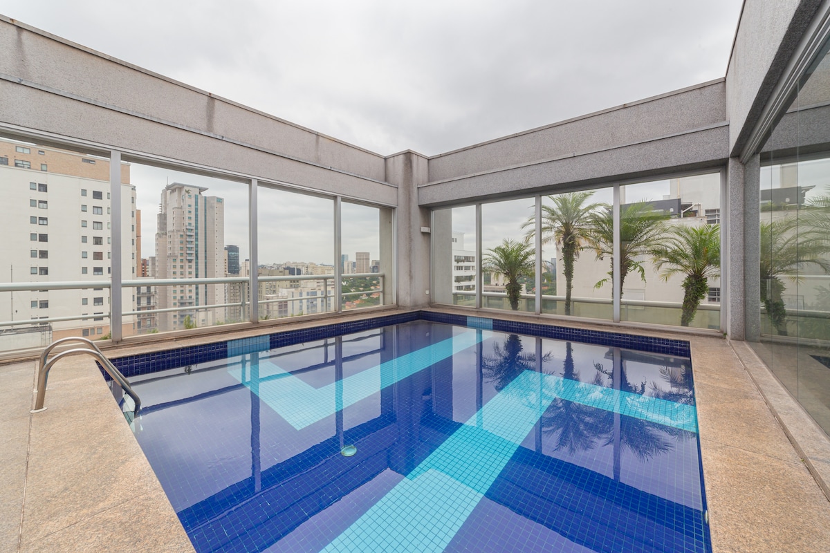 Extremely well located with maid service and cleaning every day. Excellent pool, gym and sauna on the rooftop. Surrounded by the most popular and award-winning restaurants and bars in São Paulo. Bright and ventilated apartment. Living room with sofa bed queen size for watching television and dining table for 4 people. Room with queen size bed and desk. Kitchen with all utensils. Parking space.