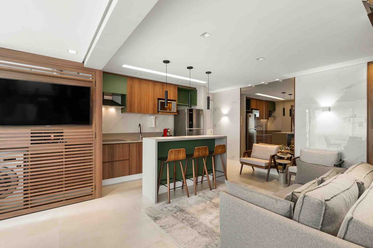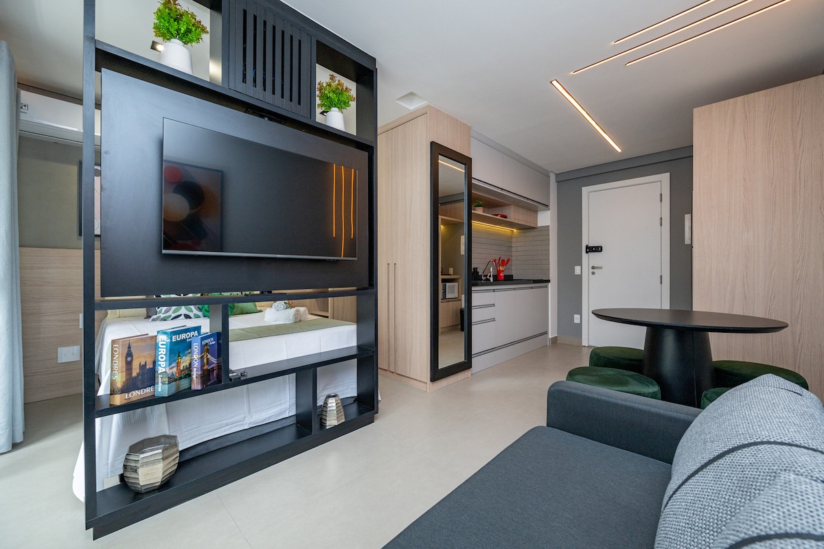 Welcome and make yourselves at home. The apartment is brand new, designed especially for you and has impeccable decor, very practical for everyday life. The view is spectacular! The apartment is on the 28th floor. We are in an excellent location in São Paulo, in the Pinheiros neighborhood, with restaurants, supermarkets and bakeries very close by. It's 40m2 (430 sqft) with 1 bedroom and 1 bathroom. Walking distance from Fradique Coutinho subway station (just 2 blocks).