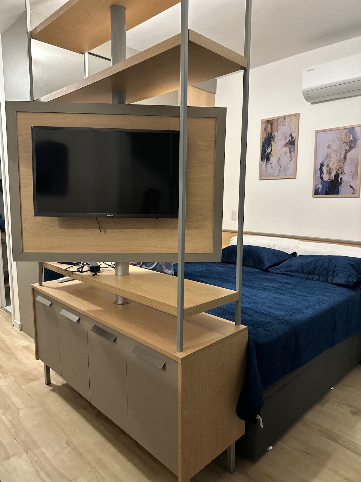 Boutique studio with one of the most beautiful views of São Paulo city. Placed 2 minutes walk from the subway. Fully equipped kitchen with refrigerator hidden by wooden door. Wi-fi, air-conditioning and smart TV 55 inches. Self check-in with smart electronic lock. Play tennis or go o gym and relax in the pools (outdoor or heated indoor) and saunas (wet or dry) afterwards. Common area also includes co-working spaces and laundry. Visitors need to be previously registered at the front dest.