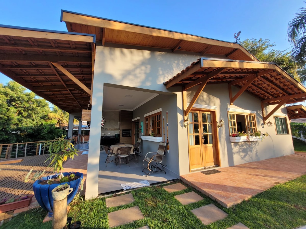 Casa estilo rústico , espaçosa, com cozinha gourmet fechada com vidros blindex , que se abrem no verão e podem ser fechados no inverno ,com churrasqueira, fogão a lenha e a gas. Temos 03 suítes completas e decoradas, com tvs ventiladores de teto e roupas de cama e banho. Ampla varanda. jardim , piscina , e wi-fi 5G que funciona bem na casa toda . Estamos a poucos minutos do centro da cidade onde se encontra todo tipo de comércios ,mercados, lojas, farmácias ,agropecuárias etc