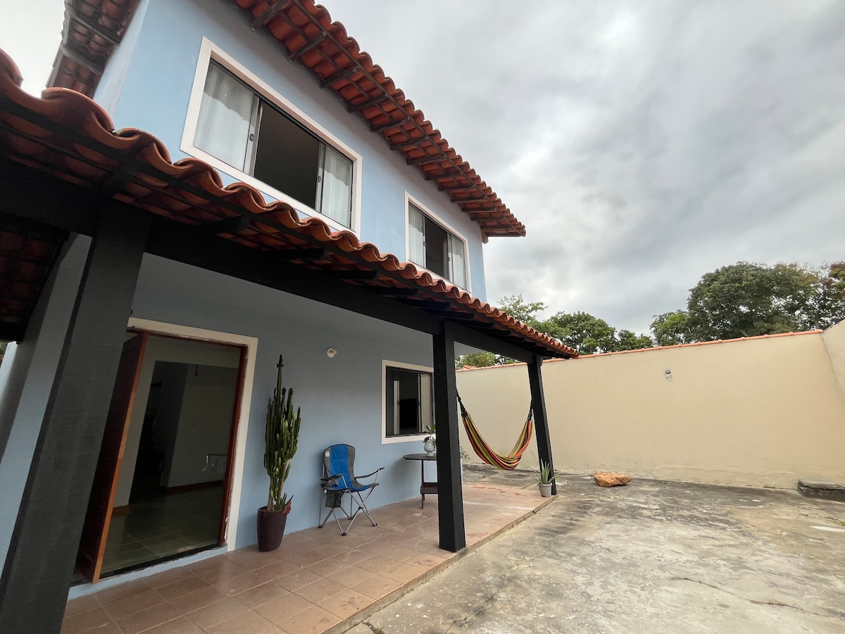 Casa completa que acomoda confortavelmente estadias longas e/ou curtas. Foi a casa onde moramos então a mesma ficou 100% montada quando mudamos. Possui ar condicionado nos 2 quartos, wifi e um ponto importante: a garagem é estreita, indicada para 1 carro hatch, incerto caber carros maiores, mas pode acontecer. Localizada próxima a padarias, mercados, farmácias, bazar, academia, polo gastronômico e etc. Fácil acesso ao Shopping Park Lagos (1,5km de distância), praias, Arraial e Búzios