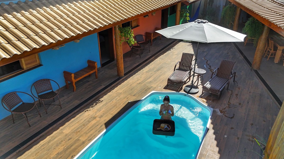 Hospede-se nessa casa tranquila e aconchegante. A casa possui 2 quartos, cada um com uma cama de casal. Em um quarto há ar condicionado. Há tv nos dois quartos! Há um colchão de casal extra. Possui 2 banheiros com chuveiro, 1 na área interna e 1 na área externa. Há uma ducha e uma piscina de 4 m. Dentro da cidade, beach tênis na rua da casa, garagem para 2 carros.. Perto da saída para as cachoeiras. Obs: Traga seu lençol, fronha e toalhas, disponibilizo somente cobertores e toalhas de rosto.