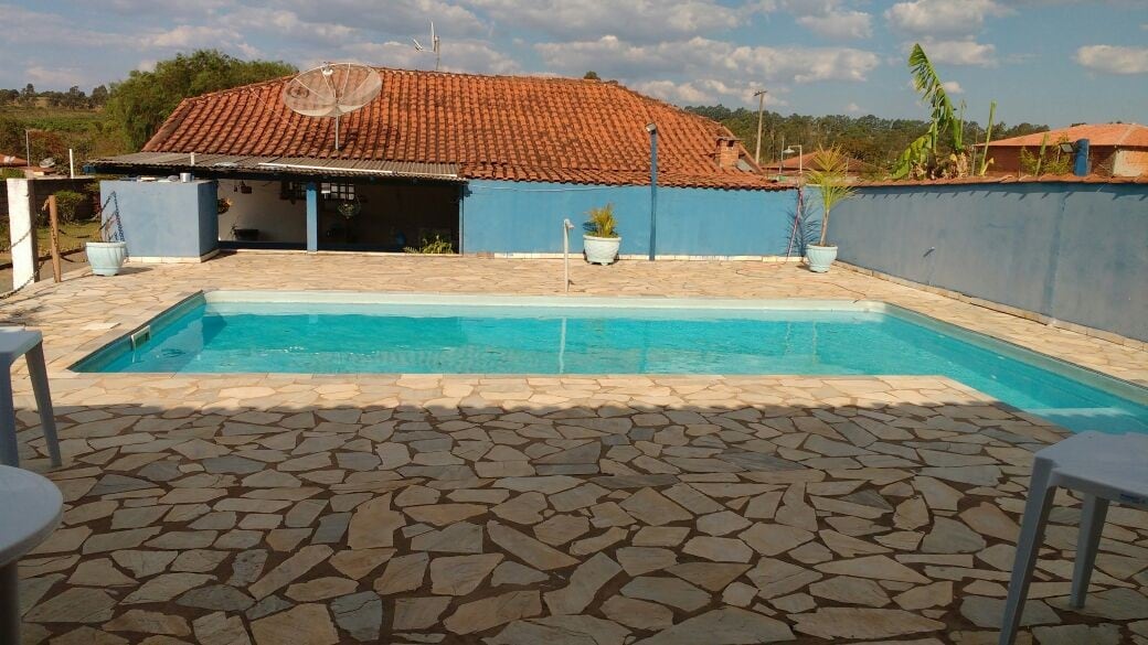 Casa de campo com piscina por aquecimento solar. A cozinha externa conta com: ítens essenciais, geladeira, freezer, microondas, filtro de água, air fryer, cafeteira 3 corações, smartTV e 2 banheiros -Wi-Fi 🛜 -Suítes c/ ar condicionado -A sala possui lavabo, sofá confortável e smartTV -Alugamos a chácara somente para até 10 pessoas -A chopeira não está inclusa no pacote -Não disponibilizamos travesseiro e roupa de cama/banho -Lavar a louça e retirar o lixo após checkout