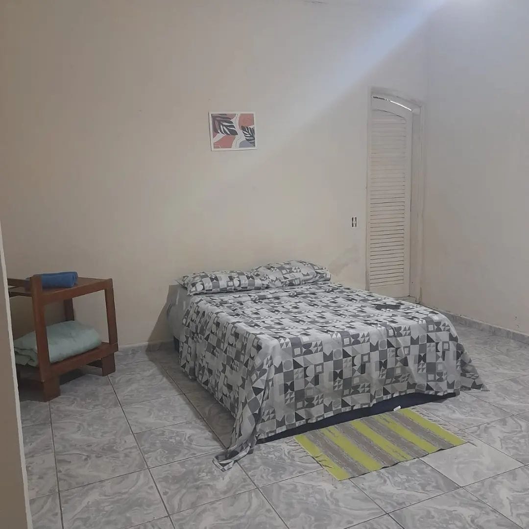 Quarto com uma cama de casal, tríliche, TV e ventilador de teto. Localizada a 800m da praia, próximo a restaurantes, bar, padaria e mercado.