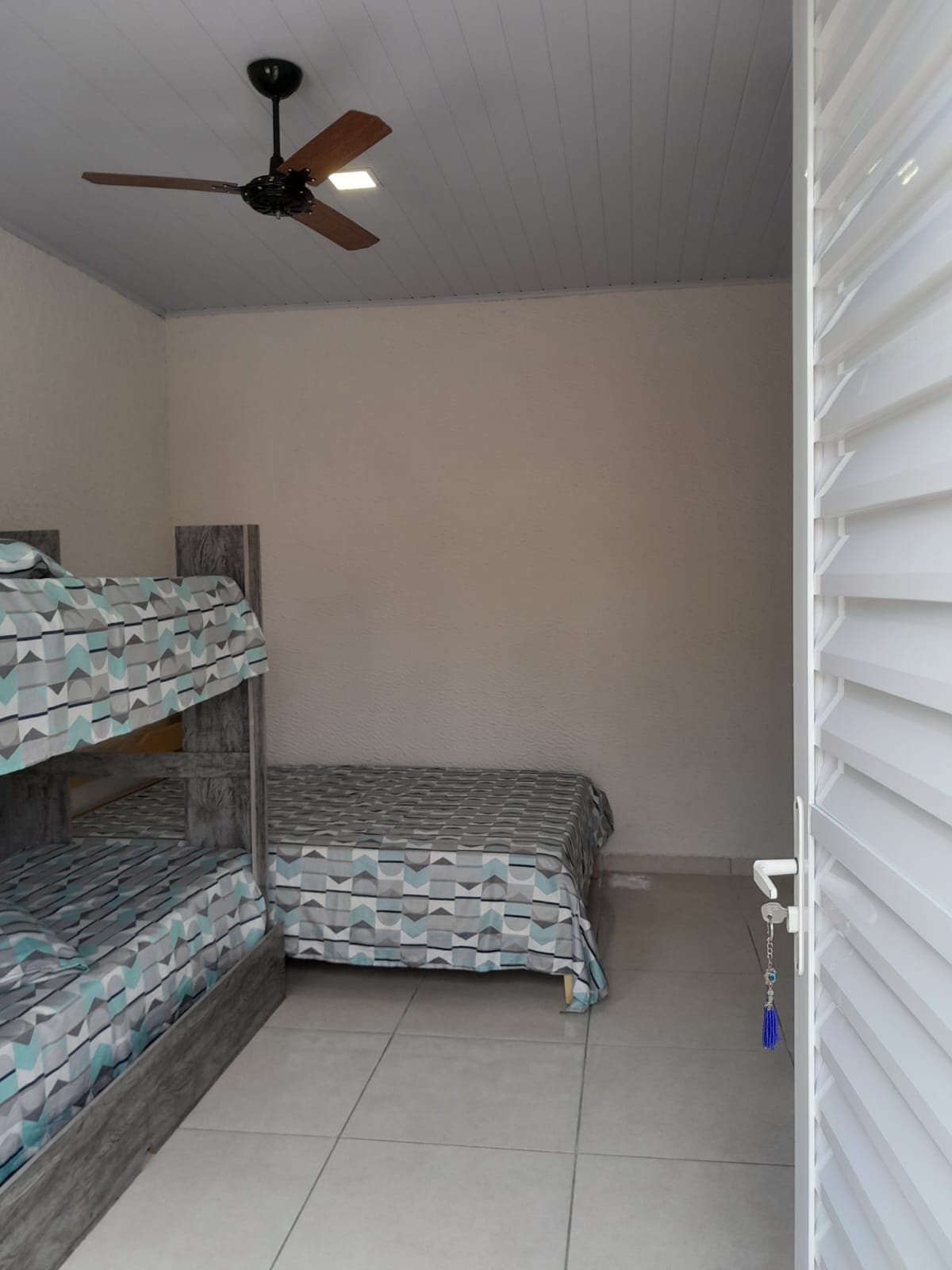 O quarto acomoda três pessoas e possui um banheiro externo.