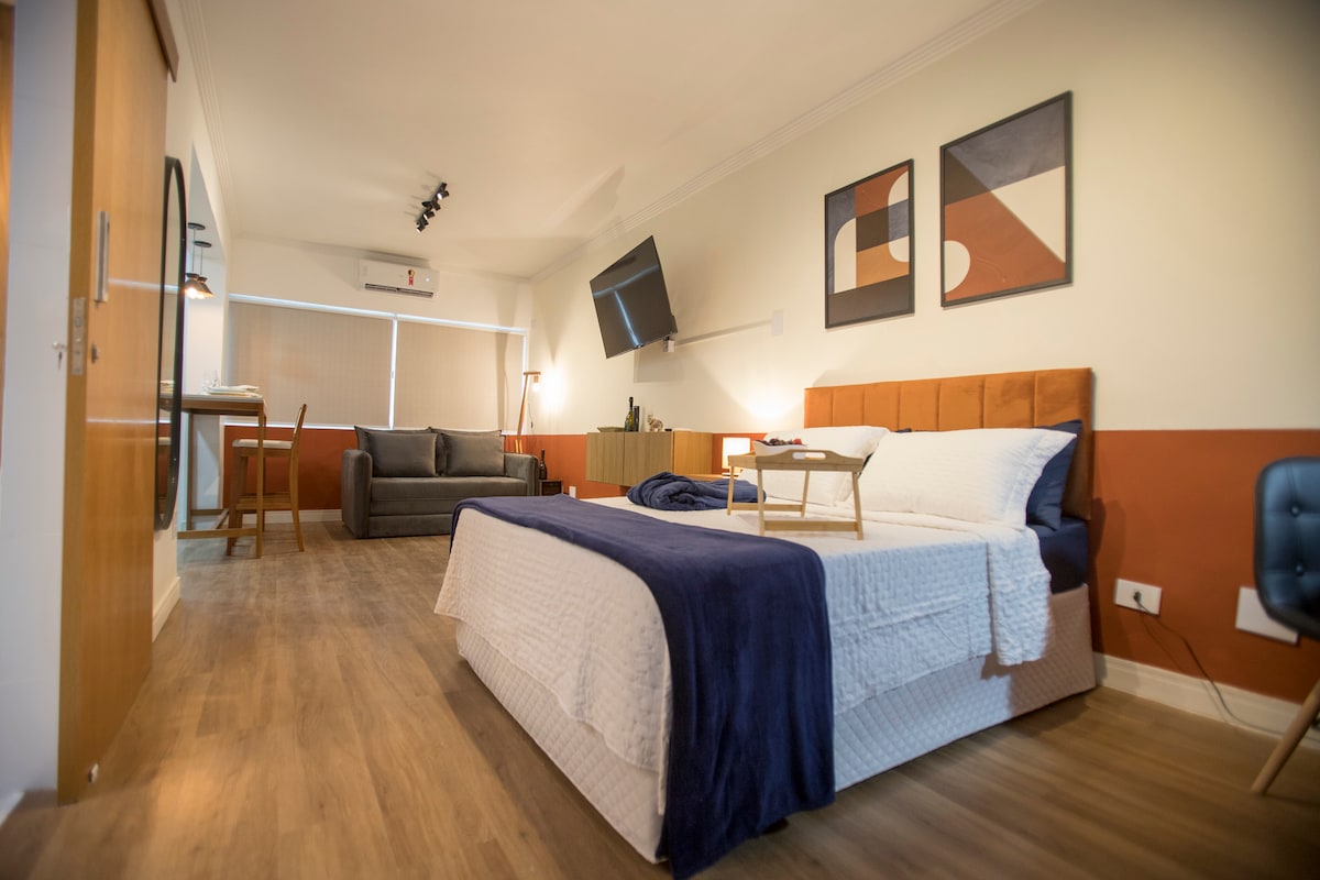Luxo e Estilo para Casais em São Vicente! Espaço exclusivo para casais de bom gosto. Relaxe na banheira relaxante EXCLUSIVA , a piscina na cobertura com vista incrível, perfeito para Lua de Mel ou datas comemorativas. Perfeito para home Office ,Apenas 600m da Praia do Gonzaguinha e 2 min a pé do Shopping, cercado por ótimos restaurantes. Comodidades: Estacionamento INCLUSO com manobrista, salão de jogos e total segurança. Equipado com microondas e geladeira . Checkin Fácil Resposta Rápida