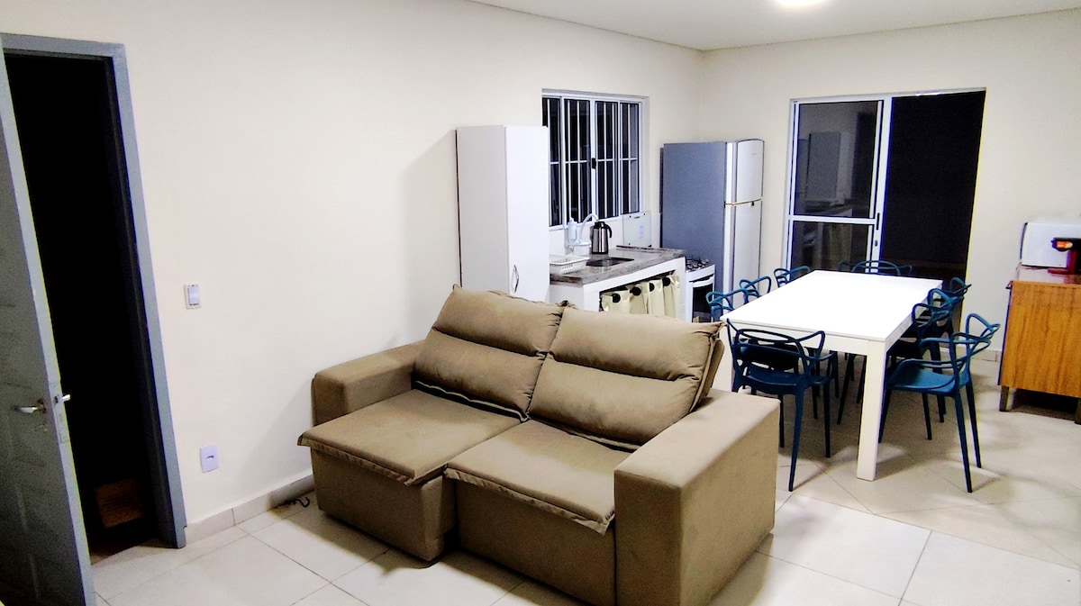 A casa de hóspedes, situada no mesmo terreno da residência principal, conta com um quarto, um banheiro espaçoso e uma cozinha completa com todos os aparelhos necessários para garantir uma estadia agradável. Como comodidades, temos smart TV e Wi-Fi de alta velocidade. Temos ainda um espaço reservado no quintal para seu pet brincar livremente. Para maior segurança, seu veículo ficará dentro do nosso espaço.