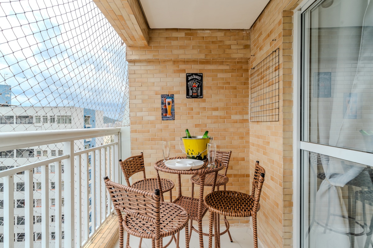 Apto com vista pro mar, climatizado e em frente a praia (pé na areia). Com vaga de garagem e portaria 24h! Vídeo do apto em @airbnb.studios Localizado em uma das melhores regiões de São Vicente, próximo ao shopping, centro e supermercado. Com uma confortável cama de casal, já com a roupa de cama. Além de TV de 50” com NETFLIX. Cozinha completa com fogão, geladeira, microondas, mesa com 4 banquetas e jogo de louça. Com área de serviços. Com vaga de garagem interna.