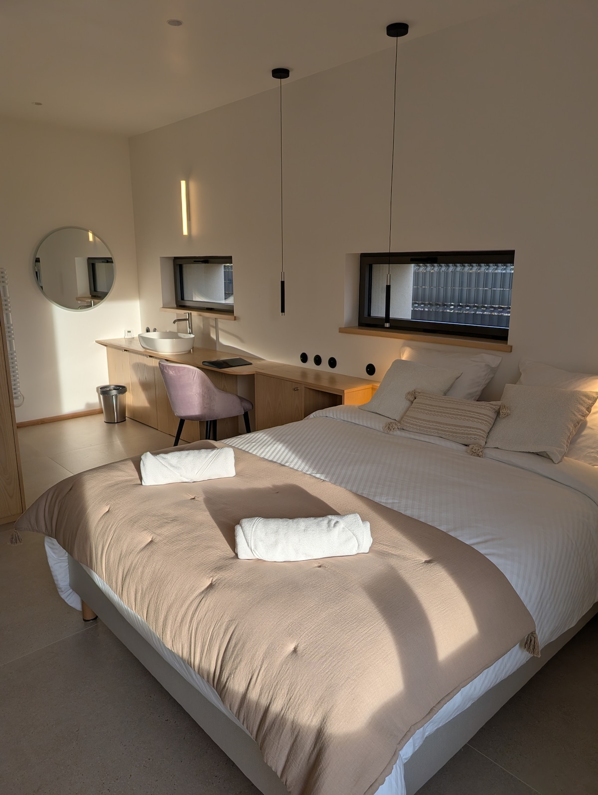 Let yourself be charmed by the peaceful atmosphere of our "Champs Fleuris" room, a true haven of tranquility. Located on the countryside side of the property, it offers an open view of the surrounding fields, perfect for a gentle wakeup in the heart of nature. Ideal for a restful getaway, a family stay, or even a quiet workspace, this room combines modern comfort with a serene ambiance. Enjoy a relaxing stay, lulled by silence and picturesque rural landscapes. Common room reserved for breakfast.