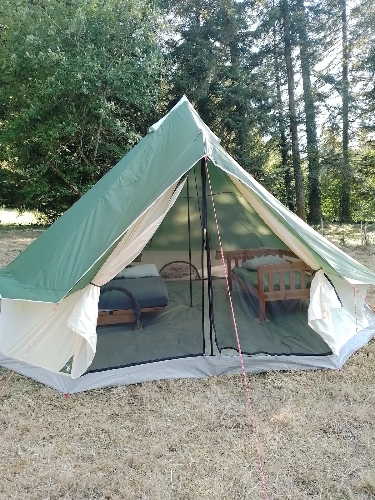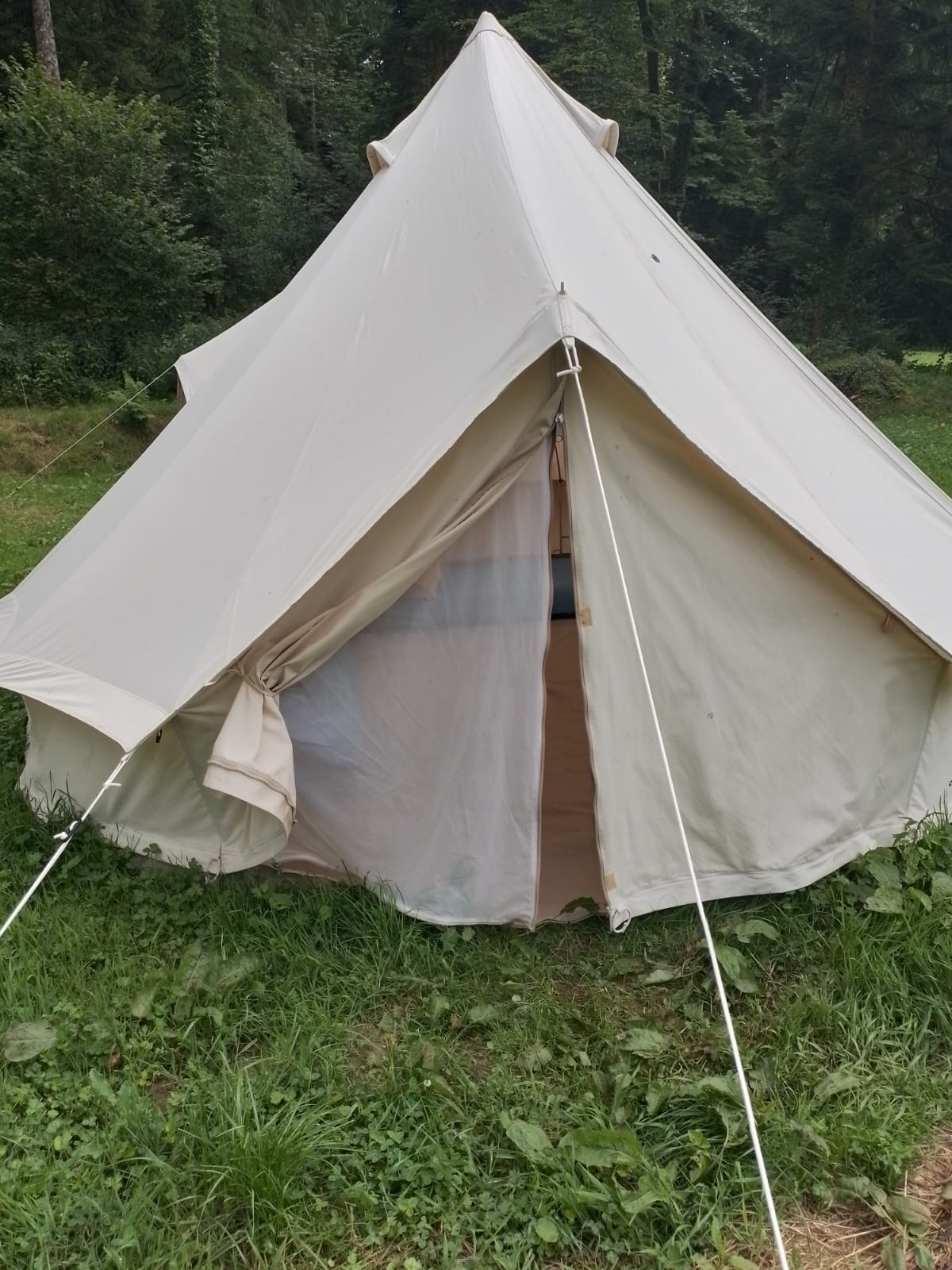 Venez profitez du confort de notre tente bell , alliant confort et joie de dormir en pleine nature . vous disposez d'une cuisine extérieure couverte avec gazinière, plancha, évier, et vaisselle, réfrigérateur. la salle de bain commune avec le gîte :deux vasques, deux douches ( douche attitré a chaque hébergement) et un grand toilette. Piscine de fin mai (chauffée)-suivant la température et la meteo - se renseigner au préalable Accessible à de 10h a 20h30 partagé avec proprio et locataire
