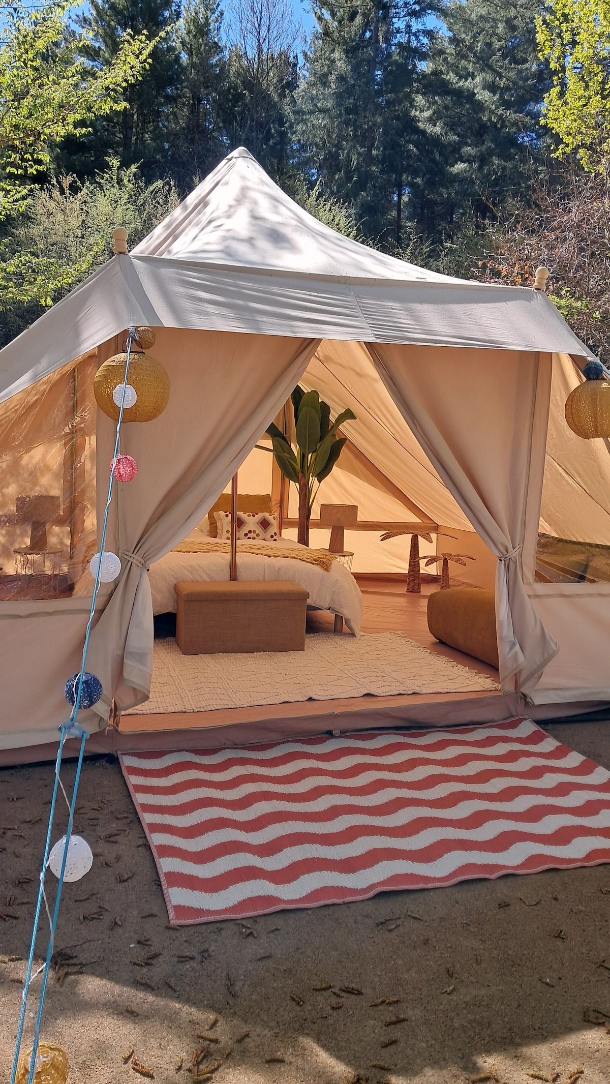 Sur une grande parcelle pour plus d'intimité, une tente de 20 M2 décorée dans un esprit zen et romantique. Jacuzzi privatif sur votre terrasse. Pour une expérience inoubliable, un braséro face au paysage champêtre pour faire griller des chamallows ( offerts) et vivre un moment romantique devant un feu sous les étoiles. Toilettes sèches sur emplacement. Salle d'eau privative à 40 mètres de la tente. Frigo avec soft drink offert. Petit déjeuner, linge de lit et de toilette, ménage sont compris