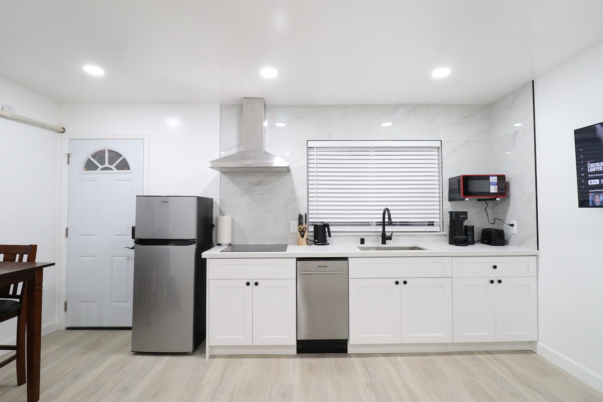 Our lovingly designed cozy but SMALL studio is perfect for solo traveler(too snuggle for 2). Modern design, upscale European stone/tile work in kitchen and bath. Private patio, parking w/ secure gate, laundry, electric fireplace, rainfall shower, LED vanity mirror, Keurig, desk, strong Wi-Fi, fully stocked kitchen w/ utensils and cookware. close to SJC Airport, SJSU campus, SAP Center, Convention Center, Downtown SJ, HWY-87, tech companies like Zoom, Adobe, PWC, EY. Walk to Japantown.