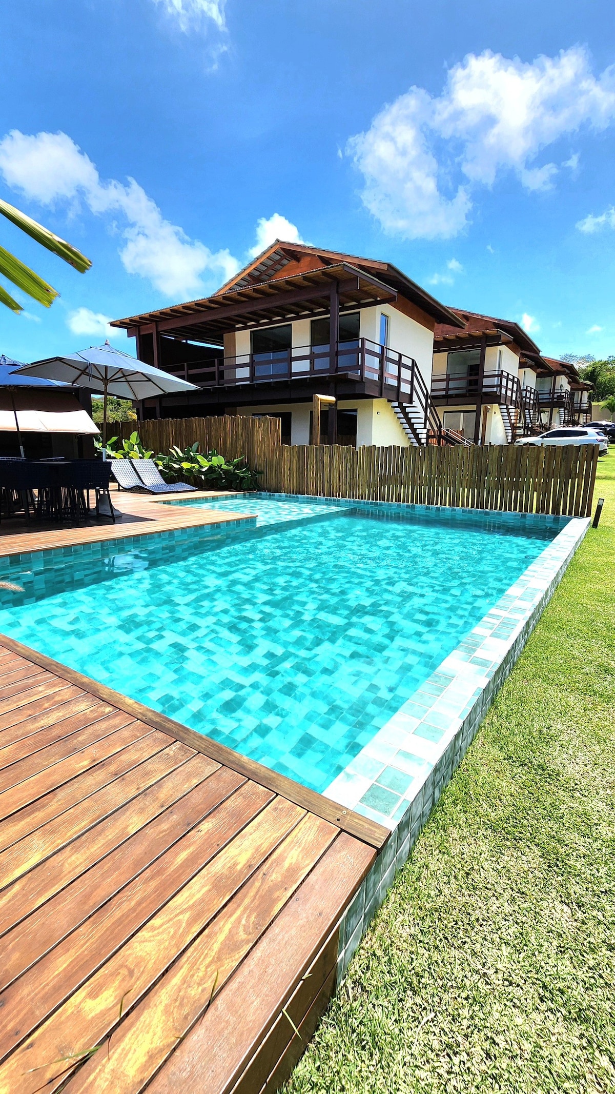Divirta-se com toda a família neste lugar cheio de estilo. O Bungalow de Madeira está no Condomínio fechado Parque de Jacuipe com segurança 24hs á 700m da Praia e do Rio Jacuipe. Oferece tudo o que você busca para as suas férias! Excelente localização, entre Arembepe e Guarajuba no litoral Norte da Bahia. Conforto, bom gosto e simplicidade rustica em material de primeira qualidade são características desta residência que tem 3 banheiros, 3 quartos, sendo um deles suíte.