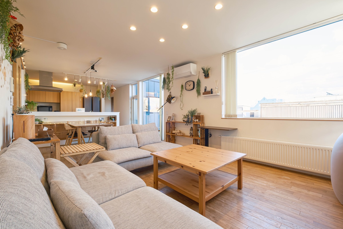 広々とした一軒家&グランピング体験も♪ リビング以外にもお部屋は5つ!!!! ◇デザイン性が高い空間◇ 収納スペースが豊富なため、大人数でご利用の場合も居住空間が散らかりません! ◇団欒とプライベート空間の両立◇ 部屋数が多いため 大人数で集まって過ごすスペースと それぞれが落ち着いて過ごす部屋を両立しています。 ◇おすすめ無料設備◇ リビングではプロジェクターと120インチの特大スクリーンで動画鑑賞可 近くに大型スーパーもあり! グループや家族での滞在にも超おすすめです!! 庭も広々!オプションでBBQやプライベートサウナをお楽しみいただけます 【オプション料金】 ①BBQグッズレンタル(炭なし) ②サウナ小屋(薪あり/オガライト10kg) 全て込みのセットで¥24,000 クーラーはリビングに1台のみ。 (扇風機は複数台あり) 暖房は各部屋完備。 *1Fにホスト居住スペースあり、立ち入り禁止区画あり 詳しくはお問い合わせください 2026年4月1日より 宿泊代には宿泊税が含まれています。 別途、宿泊税を徴収するわけではありません。