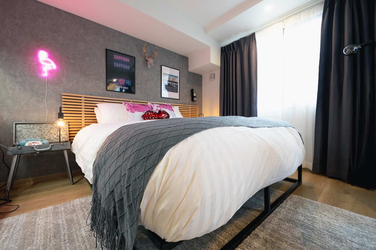 【1】 位于札幌市,距离日本三大娱乐区之一的「Susukino」仅有徒步2分钟的理想位置。这家酒店提供舒适的住宿,步行即可回到充满活力的夜生活。是享受城市夜景和品味美食之理想场所。 【2】 在豪华住宅「AMSTOWER」的高楼层体验令人惊叹的景色。由Airbnb酒店协调员设计的时尚室内装修,以美丽的灰色天鹅绒沙发和以"铁"为主题的黑色内饰为特色,提升了氛围。从这个空间俯瞰繁华城市的夜景是一种独特体验,融入了闪烁的摩天轮。与亲朋好友共度难忘时光,浴室提供带按摩浴缸的非同寻常体验。卧室配有让人安心的木质床,确保您获得宁静的睡眠。 ◆交通便利 便利店、餐厅、居酒屋和休闲设施都在步行范围内。距离最近的地铁站南北线「中岛公园站」仅有2分钟步行路程。通过地铁,札幌站、大通公园和狸小路都可在10分钟内到达,非常方便观光。