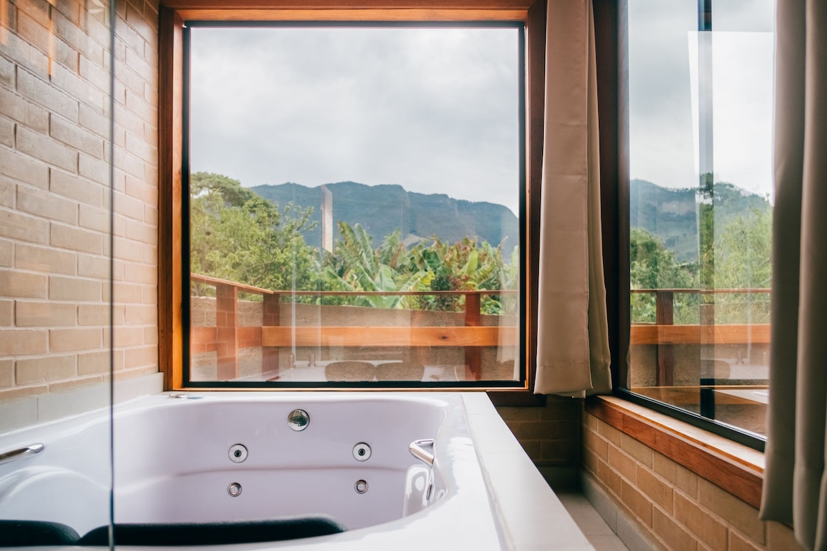 Relaxe nesta acomodação tranquila. 1 quarto com cama de casal Queen size No segundo quarto, opção de converter em 2 camas de solteiro - Tv e Wi-fi - Microondas, sanduicheira, frigobar - Chaleira elétrica e cafeteira - Lareira canadense - Hidromassagem - Banheiro com piso aquecido - Aquecedor de toalhas - Secador de cabelo - Ar condicionado - Deck com vista para a Pedra do Baú - Café da manhã incluso/servido no chalé - Roupa de cama e banho, roupão, amenities .