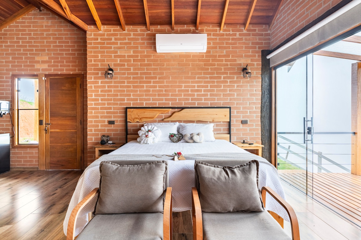 Descubra a magia da Serra da Mantiqueira nesta cabana projetada para que você possa contemplar o nascer do sol sem sair da cama. Venha relaxar em nosso spa aquecido, observar as estrelas na rede suspensa e balanço. A cabana possui um quarto integrado com uma aconchegante cama Queen. Na sala/cozinha, um futon super confortável acomoda mais dois hóspedes, tornando a experiência ideal para famílias. A propriedade também conta com trilhas e pequenas quedas d'água. Este sítio é um refúgio único.