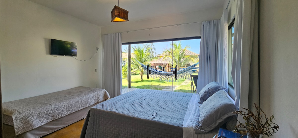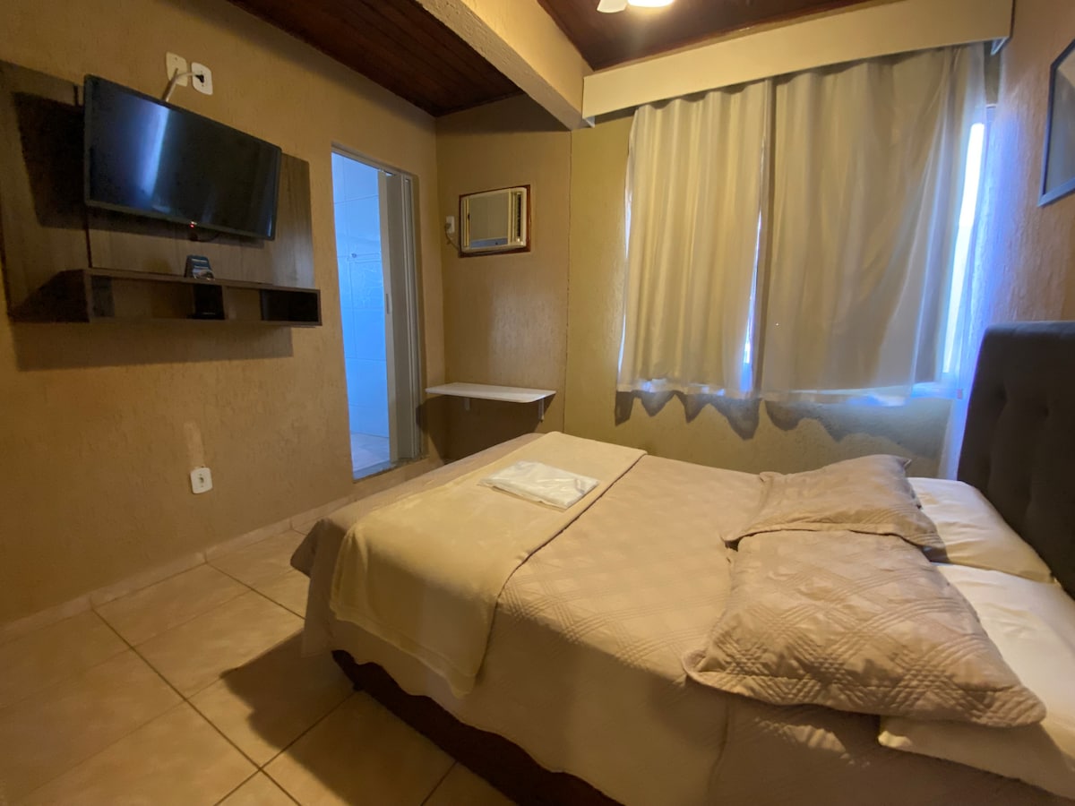 Nenhum detalhe passa despercebido nesta acomodação charmosa e sofisticada. Nossa suíte possui ar condicionado, frigobar, ventilador de teto, armário embutido, roupa de cama limpa, TV e wi-fi. Na área externa, possuí uma bela piscina para adultos e uma para crianças, jardim, rede para descanso, salão de jogos e TV, salão para café da manhã e estacionamento privativo.