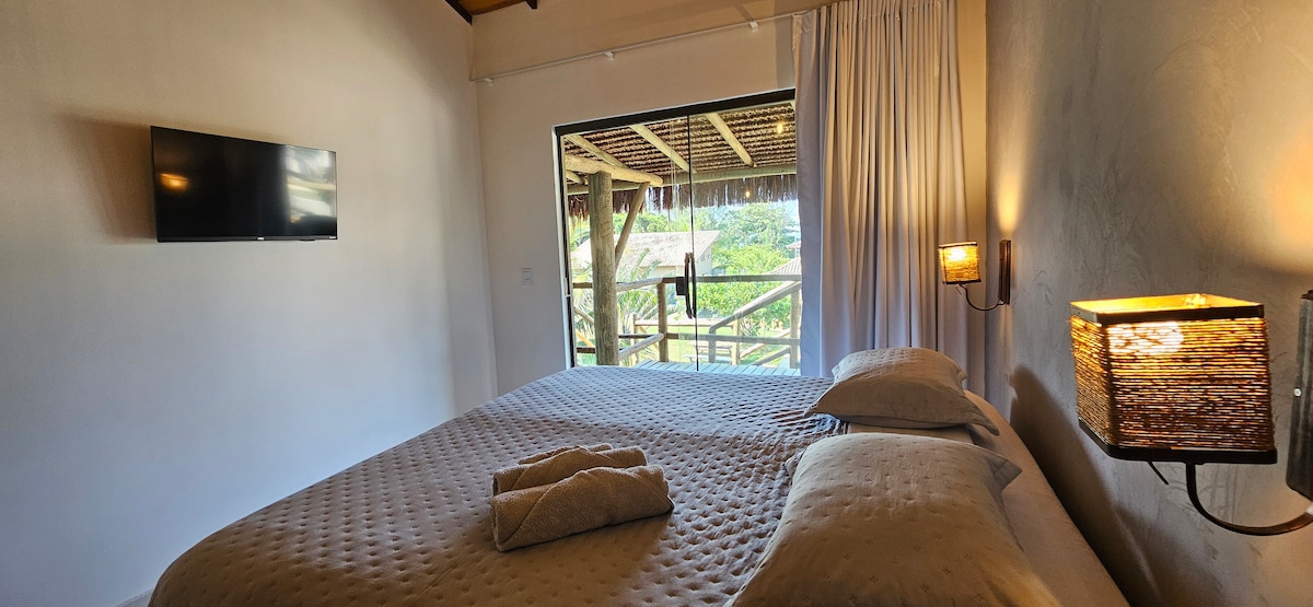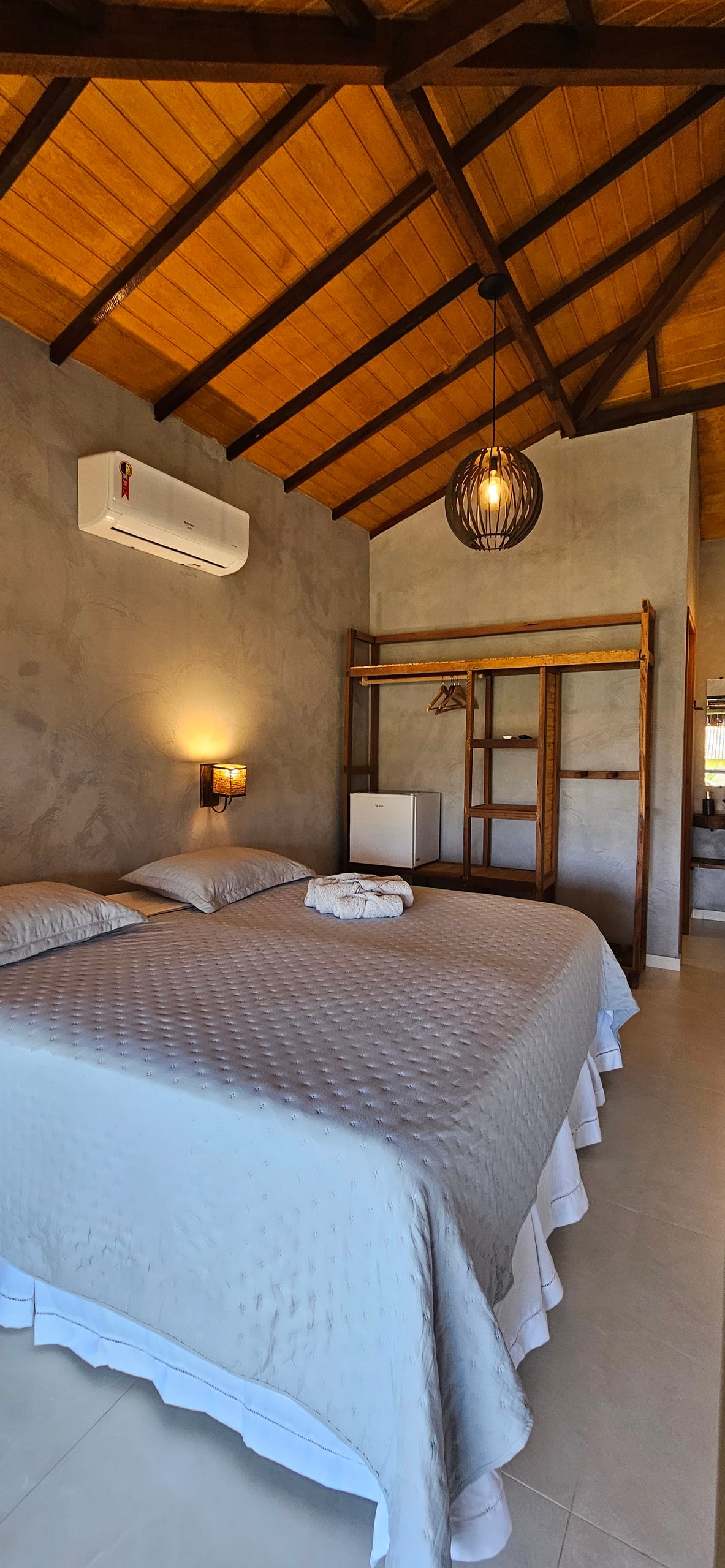Suíte no andar superior que comporta até 2 hóspedes em uma cama King ou em duas camas de solteiro. SmartTV, ar condicionado split, frigobar, estante com cabideiro, varanda privativa, banheiro privativo com chuveiro elétrico.