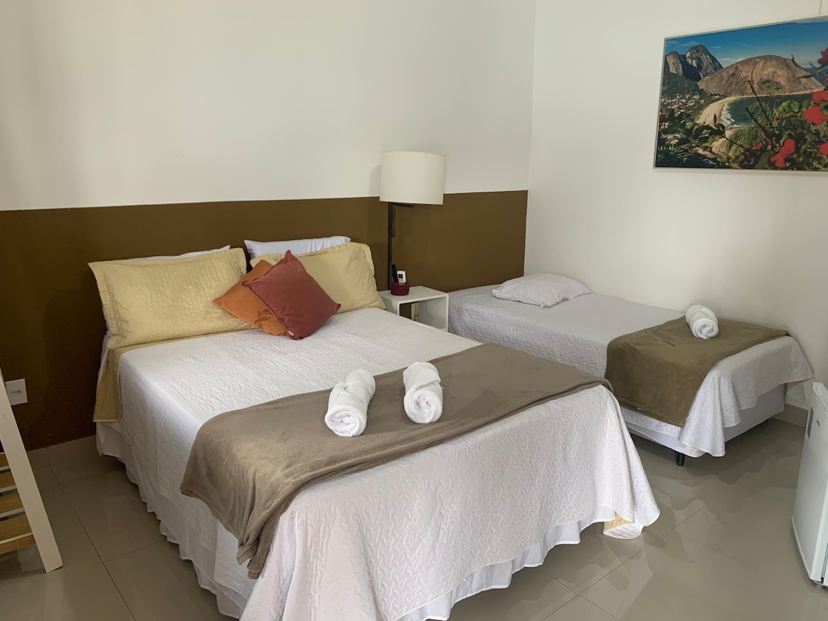 Quarto Barrinha em Saquarema – a poucos passos da Praia de Itaúna! Se você procura um lugar confortável, bem localizado e com aquele clima de praia e descanso, esse é o lugar perfeito pra você! Nosso quarto fica no primeiro andar da pousada, de frente pra piscina, em um ambiente familiar, tranquilo e acolhedor. 1 cama de casal + 1 cama de solteiro (acomoda até 3 pessoas) Ar-condicionado TV Guarda-roupas Frigobar Banheiro privativo