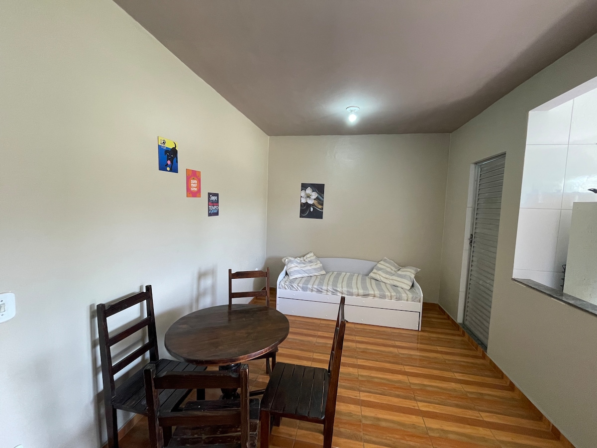 Uma kitnet muito espaçosa e arejada, mobiliada e com utensílios de cozinha. Contendo um quarto, banheiro, cozinha e sala conjugada, varanda e um pequeno quintal. Com entrada independente. Tudo isso próximo a natureza, um lugar tranquilo à proximidades da praia e da Lagoa de água doce. Ideal para descansar e para crianças. Com acesso à ponto de ônibus. Geminada. Rua tranquila sem muitas residências. Estamos sempre à disposição ao lado.