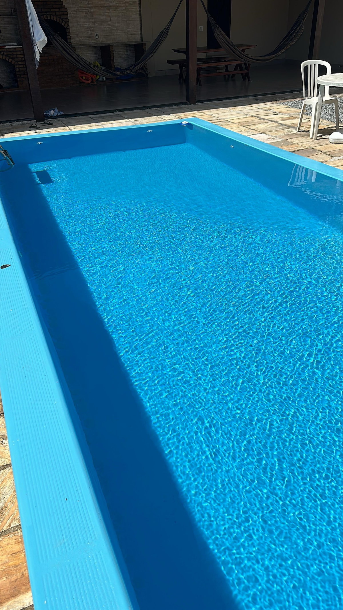CHECK-IN_ 15h CHECKOUT_ 11h Ambiente aconchegante, iluminado, confortável e limpo. Sala, 3 quartos (1 suíte ), banheiro,cozinha interna e externa, área com churrasqueira, lavanderia e varanda. Ar-condicionado nos quartos e colchões confortáveis. Microondas, bebedouro, TV55 polegadas, internet wi-fi rápido e todos os utensílios de cozinha. Limpeza da piscina a cada dois dias se for necessário. Padaria, lanchonete, mercado e restaurante próximos. Fica localizada com acesso a 4 quadras da praia.