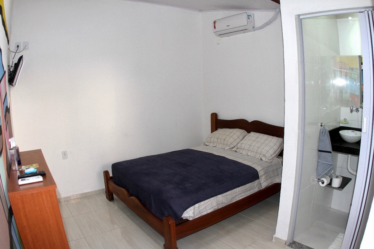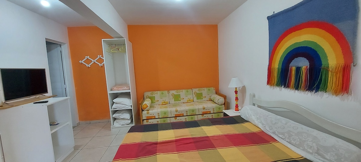 A suíte 1 da Casa do Point é a menor e por isso a mais em conta. São duas camas de solteiro, ou uma de casal, banheiro completo, prateleiras, pequeno armário suspenso. Ar condicionado, TV Smart, frigobar, (disponibilizamos na cozinha comunitária: microondas, utensílios, cafeteira, sanduicheira, panelas) , varanda, guarda sol, cadeiras de praia, estacionamento. O jardim da frente da propriedade tem vista pro mar e a de uso comum a todos os hóspede.