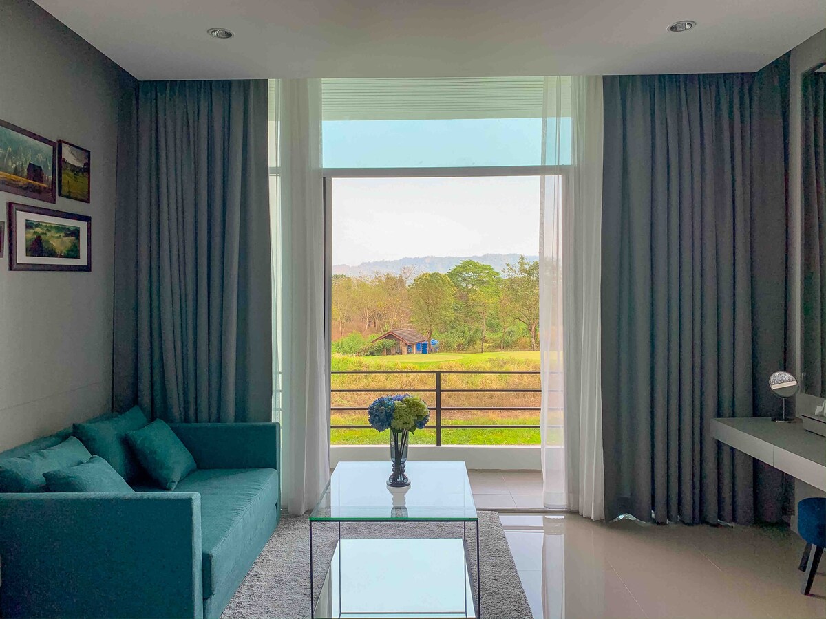 Enjoy your vacation in Tuscanian atmosphere and peacfulness in Villanova Khao Yai. 1 bedroom (71 sqm) apartment with a king-sized bed Pleasant living room with Smart TV, home theatre system, and WiFi Large dining area with electric stove, microwave, and kitchen utensils Grand bathroom with separate shower and bathtub Fairly large balcony adjacent to flower garden with swimming pool and panoramic mountain view 24 hours security service A lot of parking space