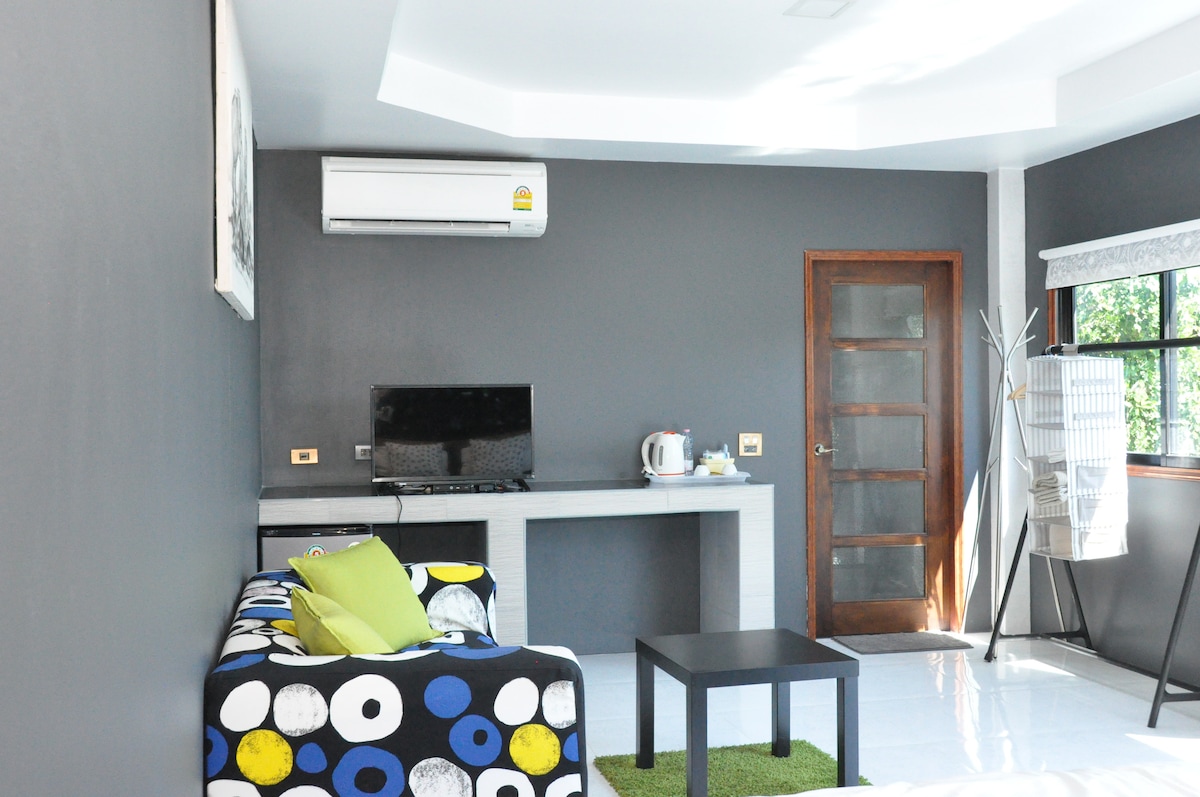 A bedroom and living room with Thai contemporay style. Our house is next to the river which you can swim like a local do or even a fish spa, a peaceful and green garden will make you feel like a paradise. Wandering around the historical area is convenient by our free bicycle or rented scooter or by Tuk Tuk, the iconic Buddha head in the tree at Wat Maha That just 3 km away. Our houses is a perfect place for traveler who want to live like a local