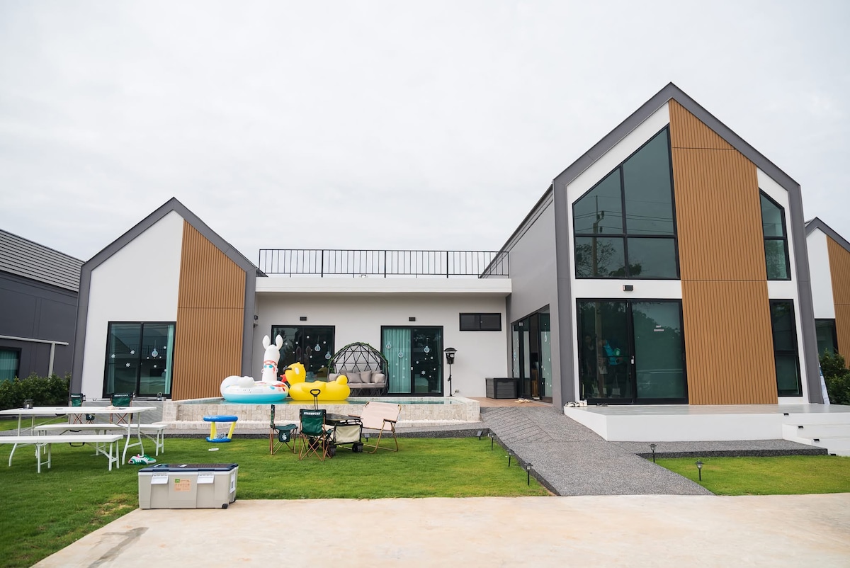 The Villa is located in Khaoyai, Nakhon Ratchasima. Bring the whole family to this great place with lots of room for fun. บ้านพักตั้งอยู่ที่เขาใหญ่ จัดหวัดนครราชศรีมา สามารถรองรับผู้พักอาศัยได้มากกว่า 25 คน อยู่ไกล้สถานที่ท่องเที่ยวต่างๆ และคาเฟ่ดังๆ มากมาย