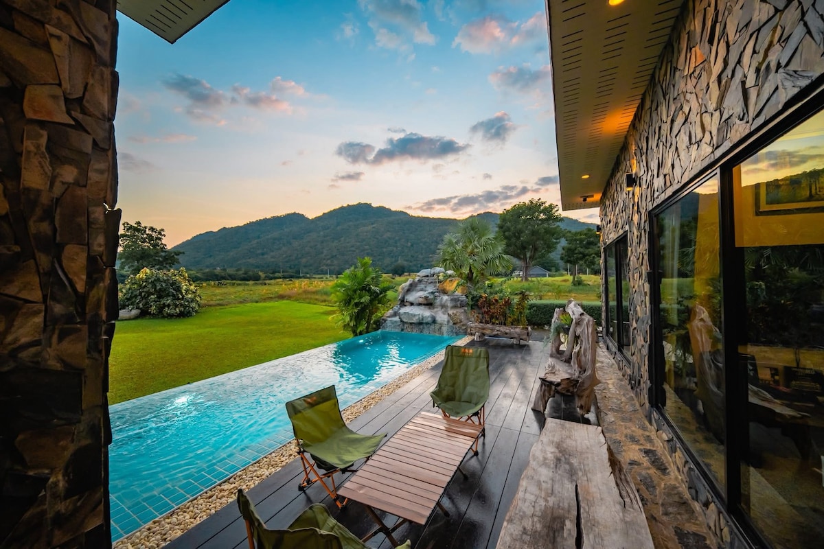 Architect’s house near Khao Yai is nestled against the stunning mountain cliffs of Nakhon Nayok, just 1.5 hours from bustling Bangkok, The Cabin offers the perfect retreat for families, couples, or solo travelers seeking tranquility and natural beauty. This rustic yet modern home, with its open terrace and balcony, offers breathtaking views of the surrounding mountains and serene landscapes. Cool off in a 10m swimming pool and enjoy true country farmland like no other.