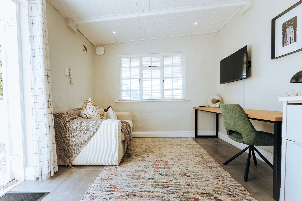 Stylishly decorated neat open plan bed, small lounge/dining area, bathroom, small well equipped kitchen for light cooking. Situated in quiet neighbourhood. Safe parking on premises behind motorised gate Solar/inverter not affected by load shedding. Limited LDSTV, Netflix 1km to beach, top restaurants, schools, boardwalk shopping centre & casino which makes it an ideal stay for IronMan, cycle races, Park Run, school, water- and other sport events on beachfront. 10 min/5km drive from airport