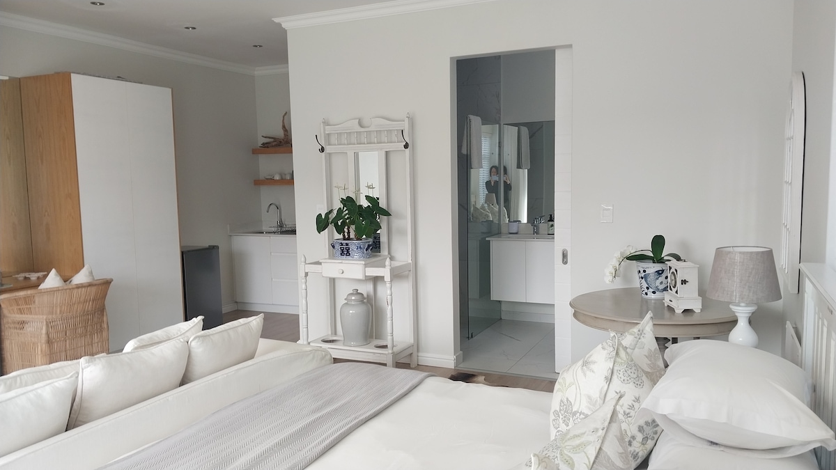 Bright new large modern suite set in the secure gated Kanonkop Private Estate surrounded by fynbos. Large sliding doors that open onto deck with garden views and very private. Open plan kitchenette with a comfy couch to relax or watch TV on a smart screen . Super King comfortable bed with 100 percent cotton percale linen. Large bathroom with a rain shower and a his and her basin. 5 minutes into central Knysna, Knysna Waterfront, and Thesen Harbor Town. Uncapped wifi . Simola and Pezula